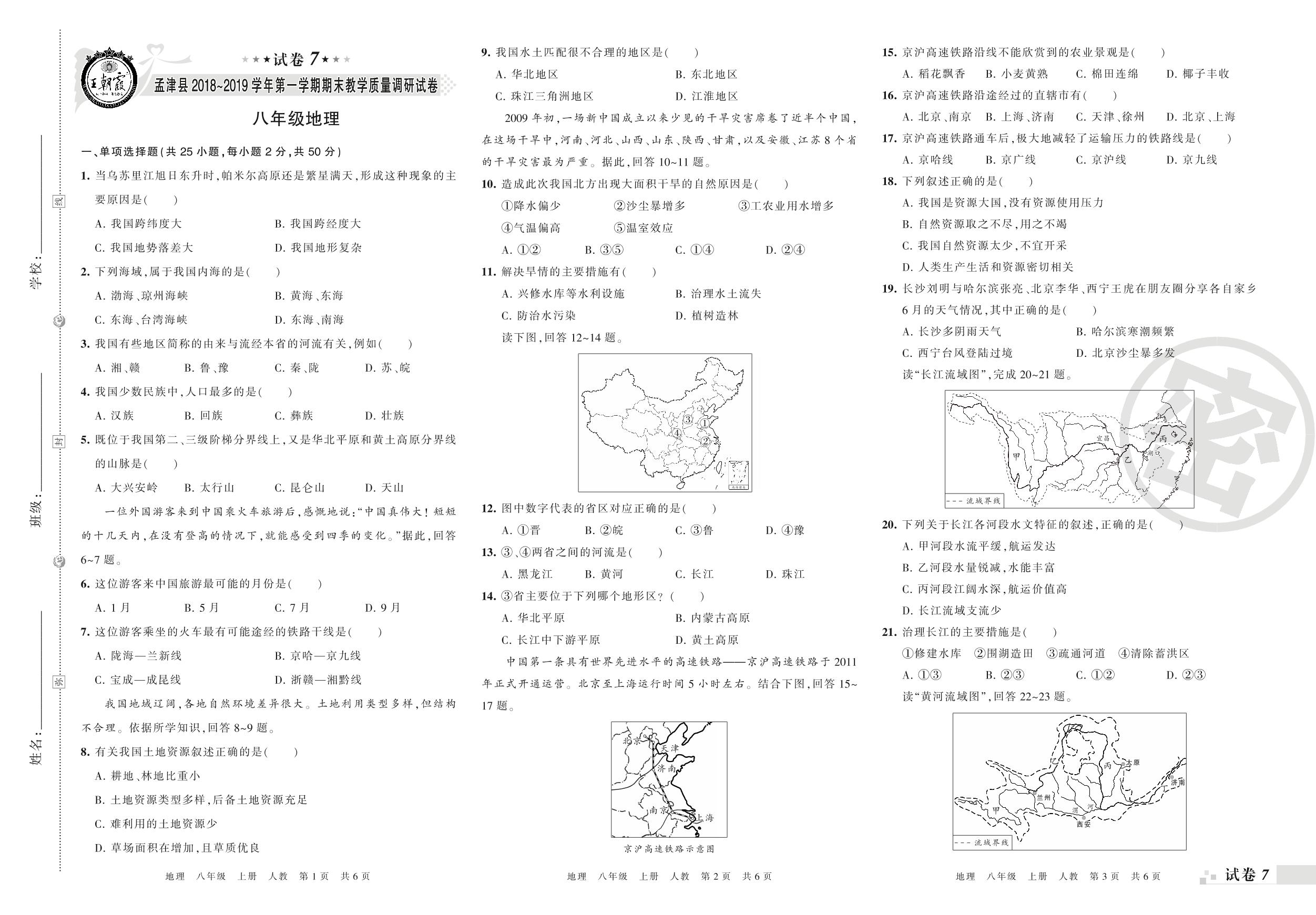 2018-2019学年第一学期洛阳市孟津县八年级地理试卷(人教版)【7】