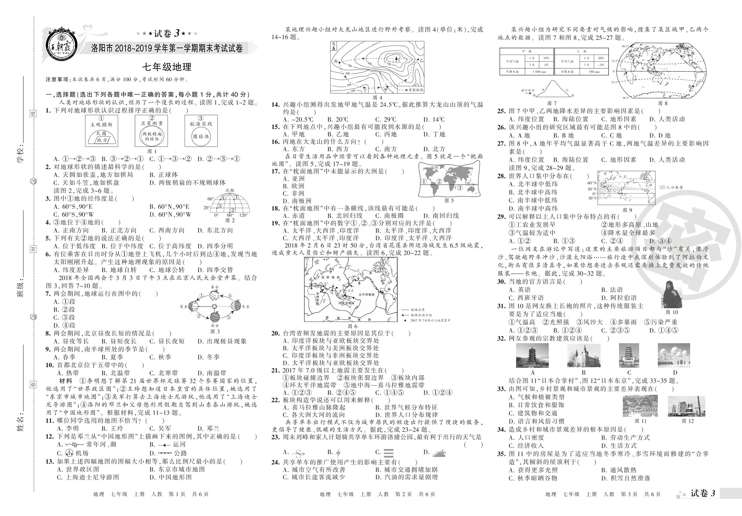 2018-2019学年第一学期洛阳市七年级地理试卷(人教版)【3】