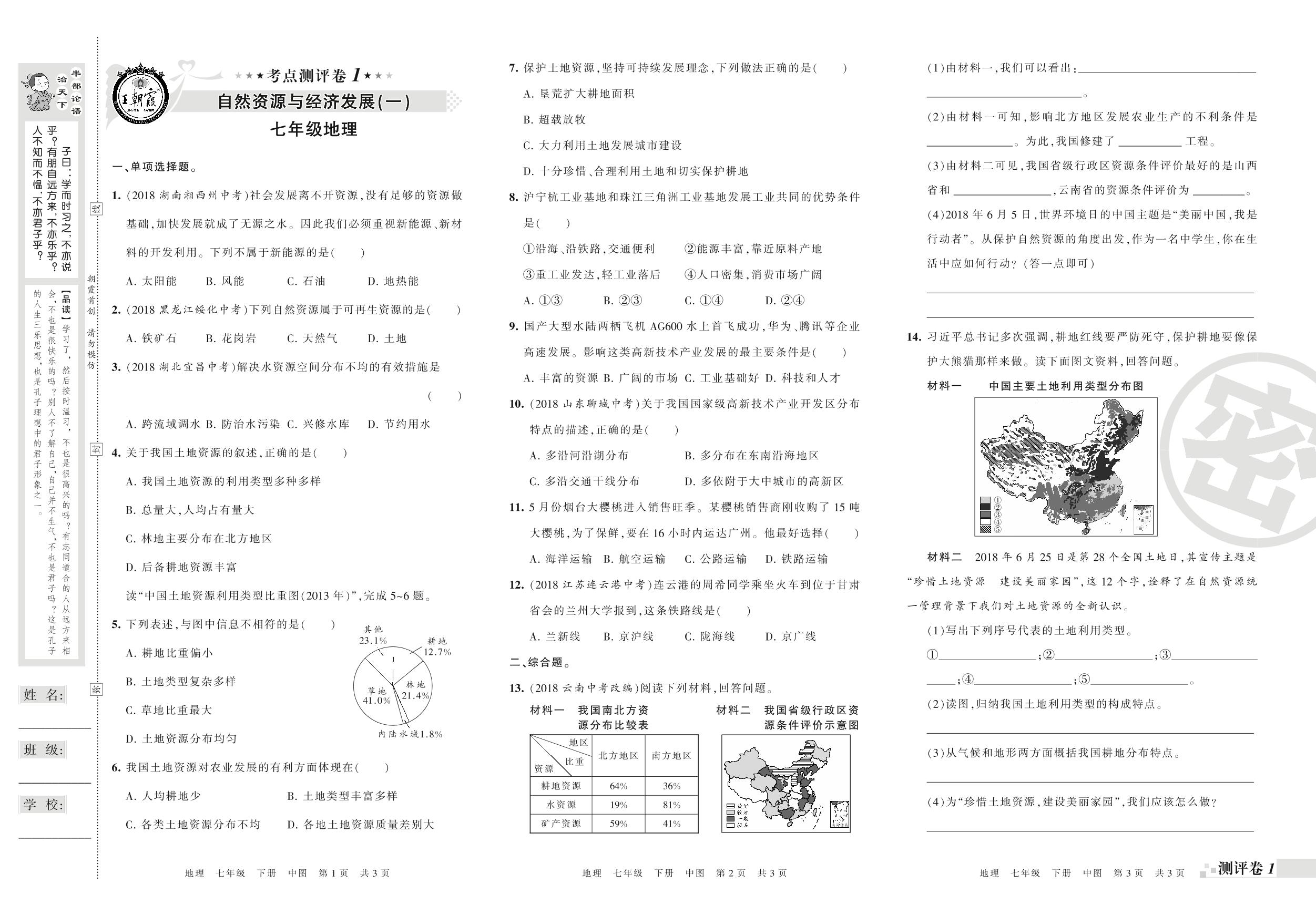 王朝霞期末测评卷——自然资源与经济发展(一)、自然资源与经济发展(二)七年级下册地理(中图版)【0】