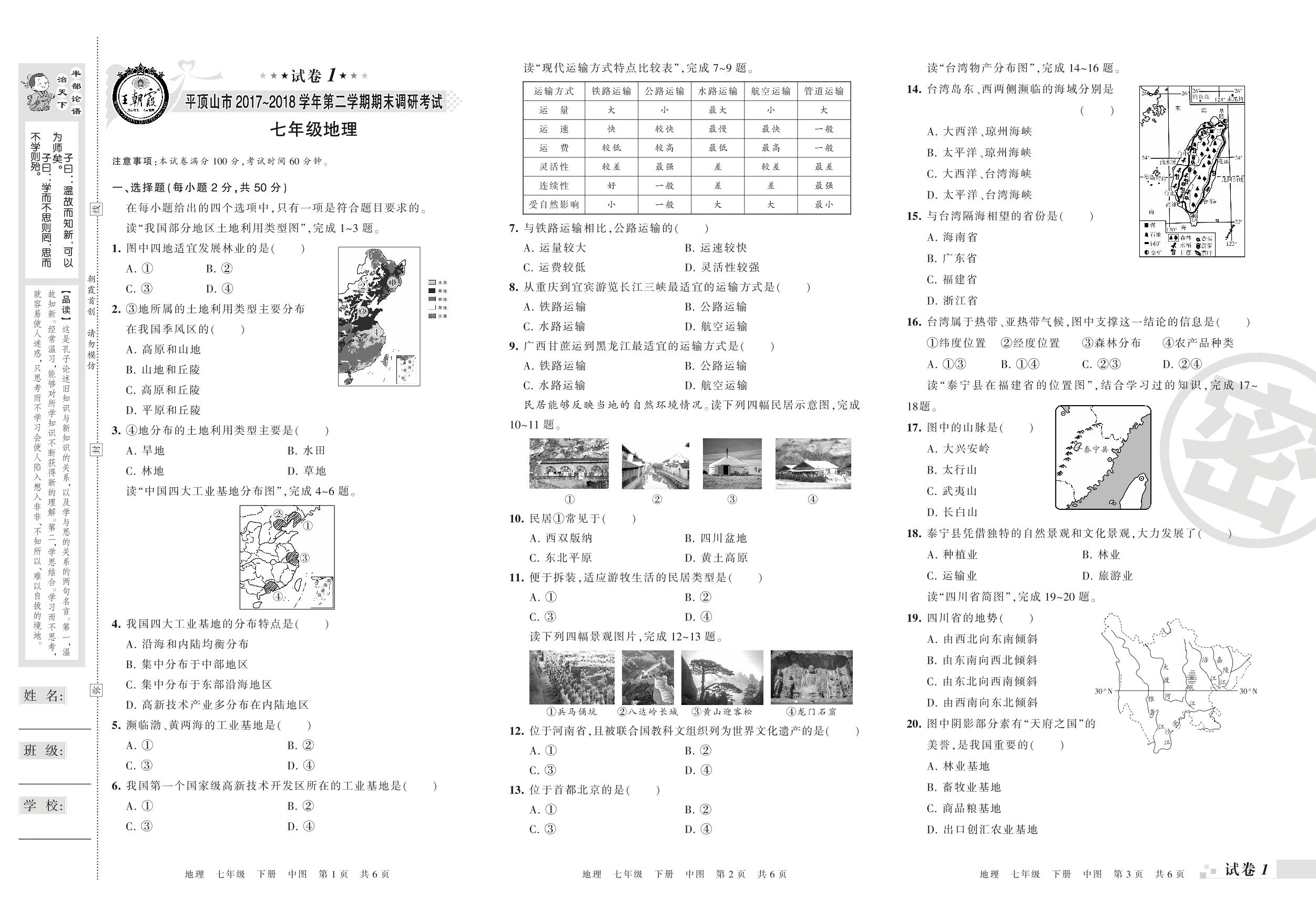 2017-2018学年第二学期平顶山市七年级地理试卷(中图版)【1】