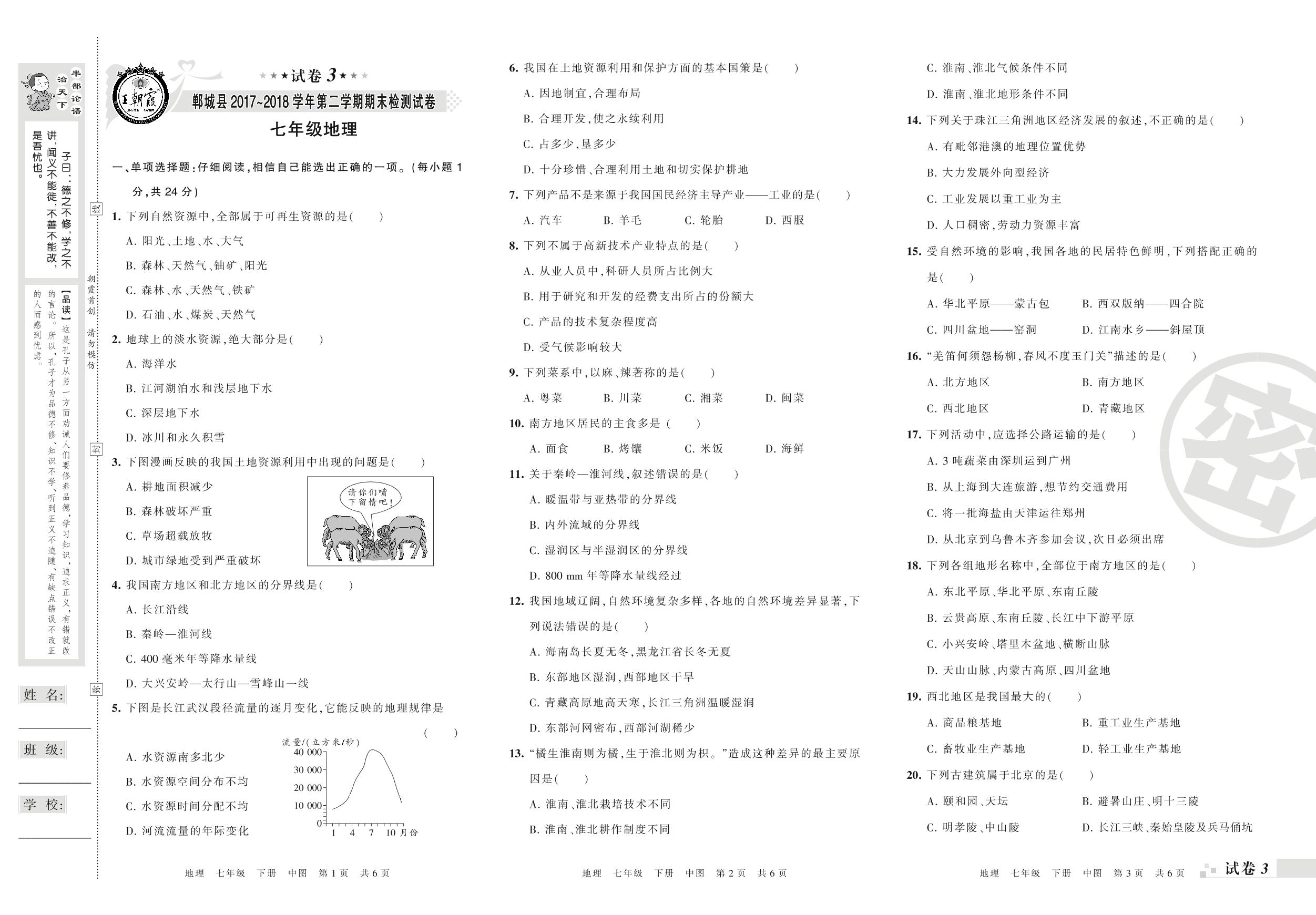 2017-2018学年第二学期周口市郸城县七年级地理试卷(中图版)【3】