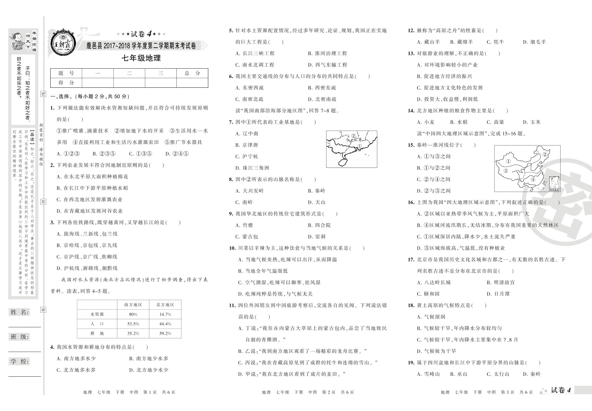 2017-2018学年第二学期周口市鹿邑县七年级地理试卷(中图版)【4】