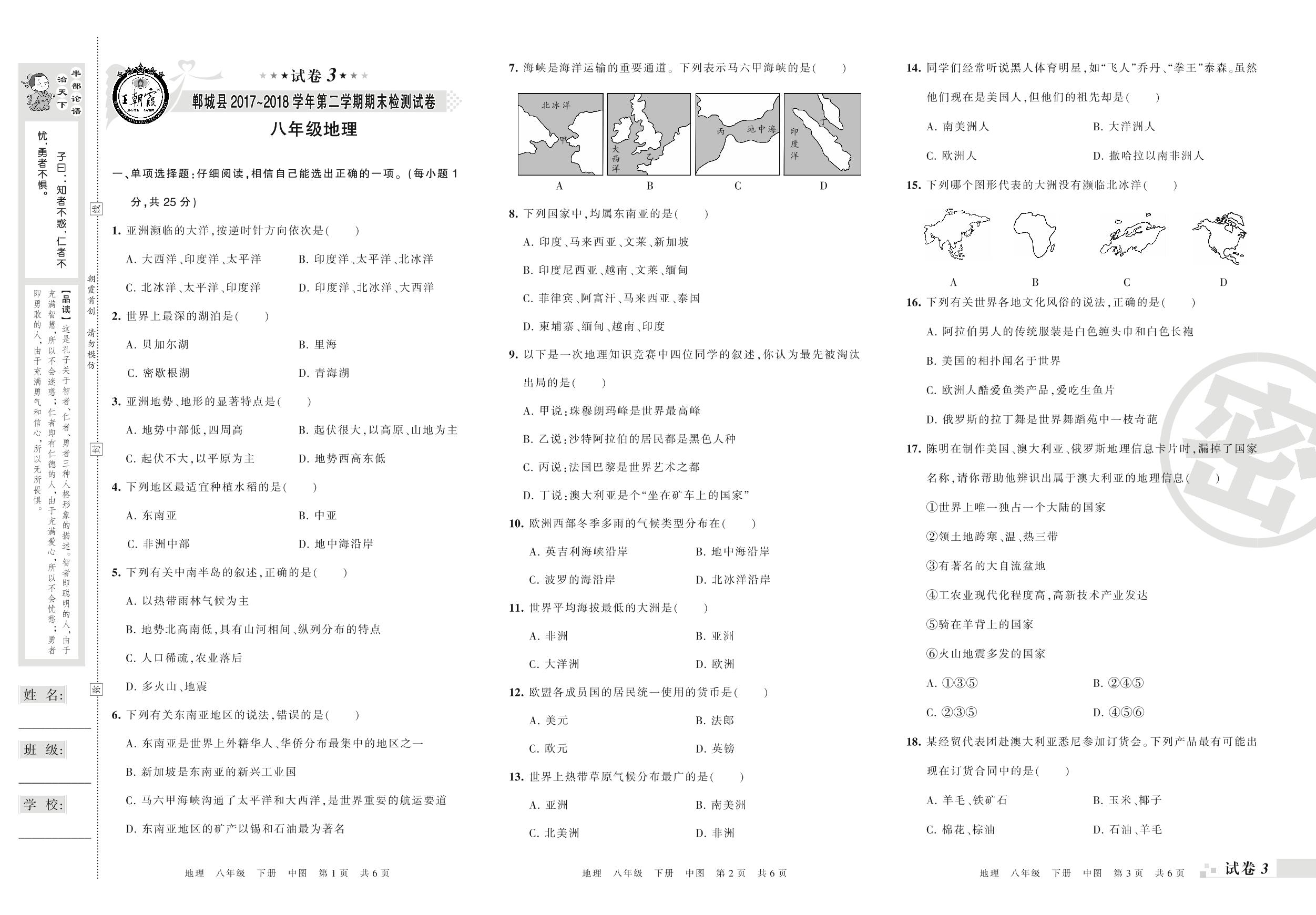 2017-2018学年第二学期周口市郸城县八年级地理试卷(中图版)【3】