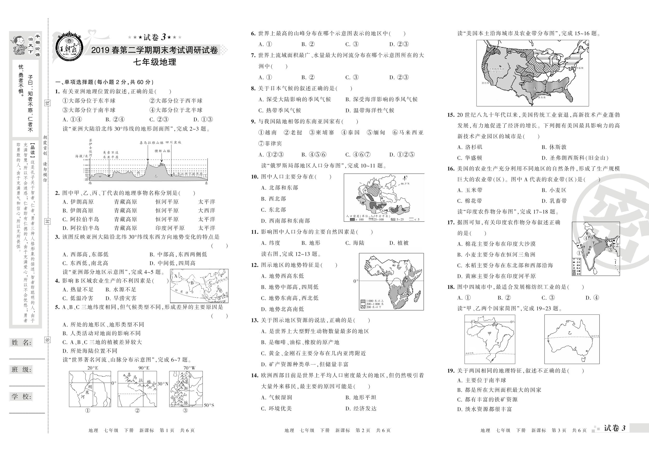 2019春第二学期调研试卷七年级下册地理(新课版)【3】