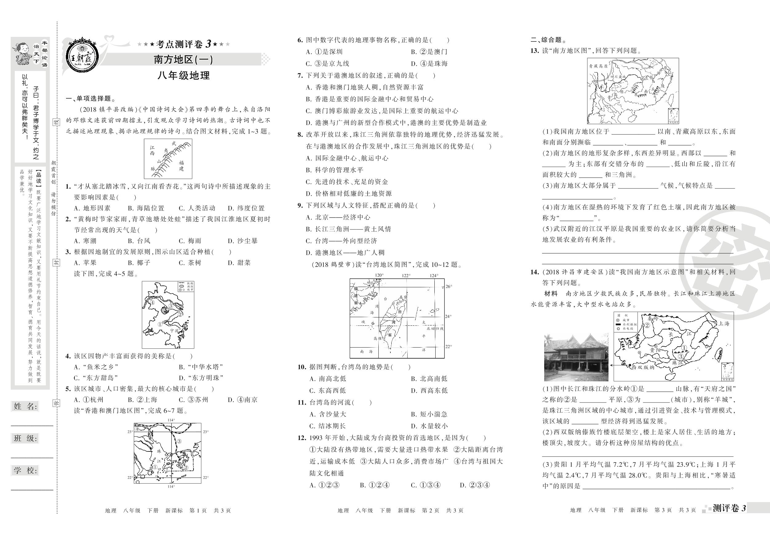 王朝霞期末测评卷——南方地区(一)、南方地区(二)八年级下册地理(新课版)【0】