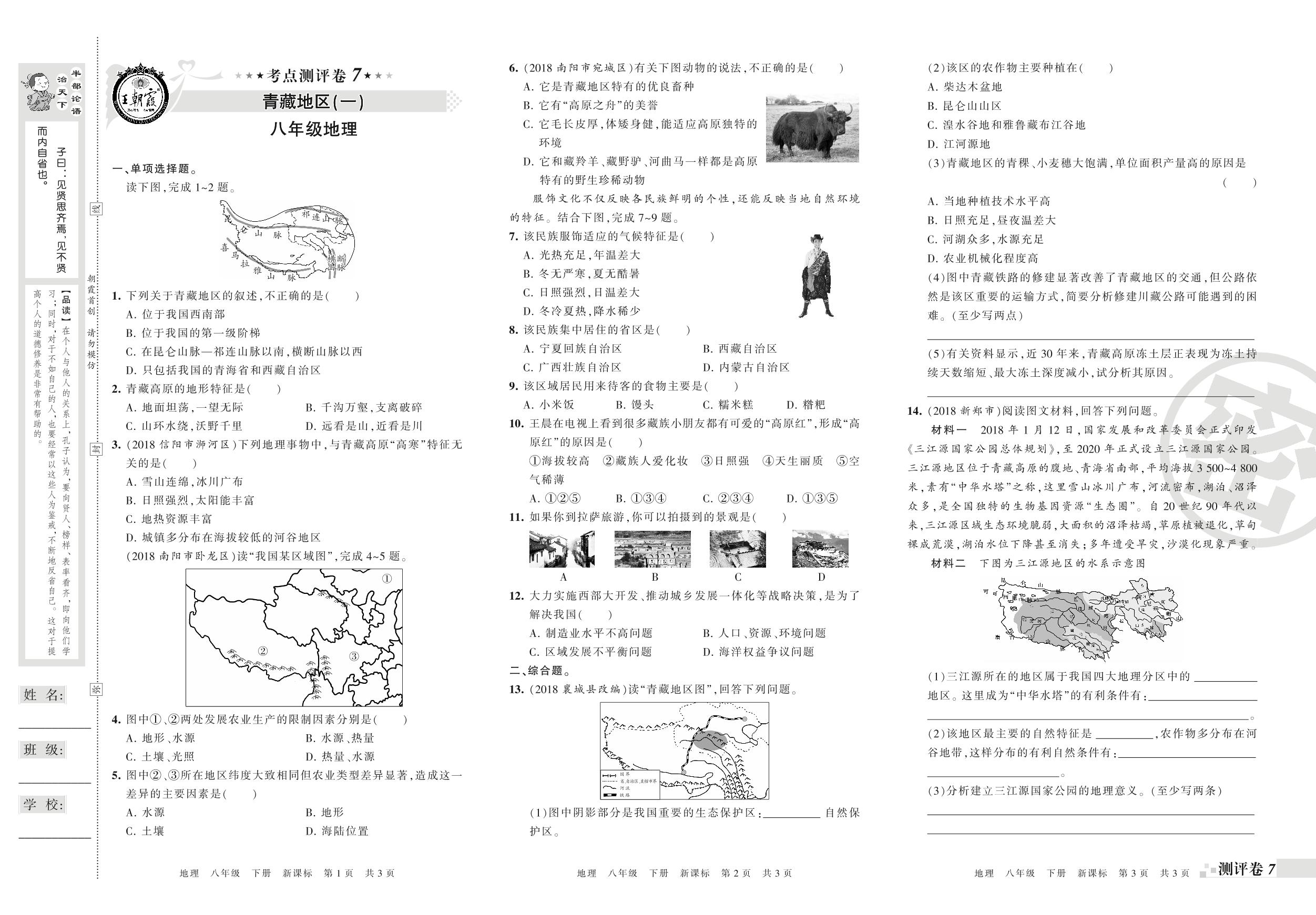 王朝霞期末测评卷——青藏地区(一)、青藏地区(二)八年级下册地理(新课版)【0】