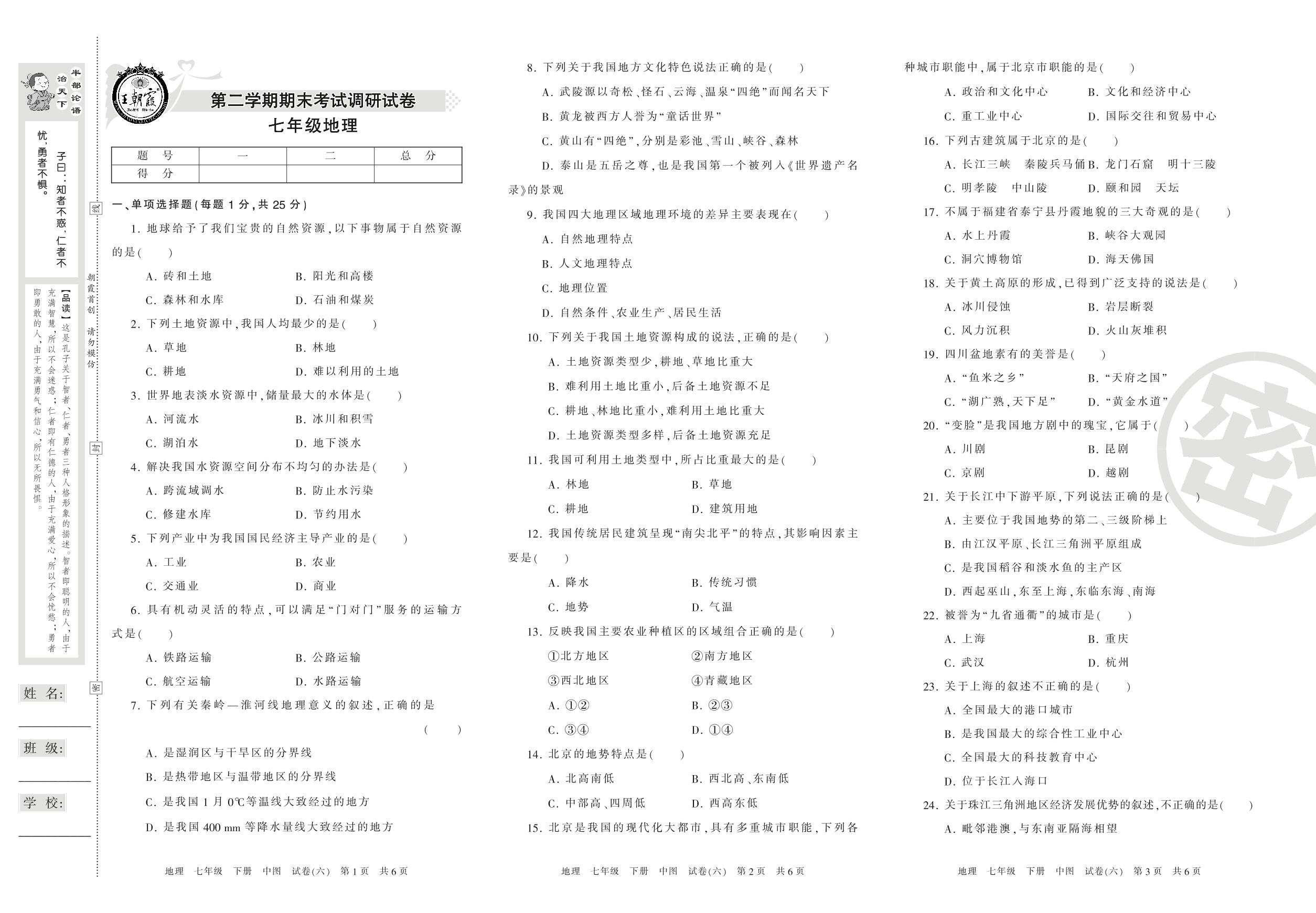 王朝霞期末调研卷七年级下册地理(中图版)_R210810144217【6】