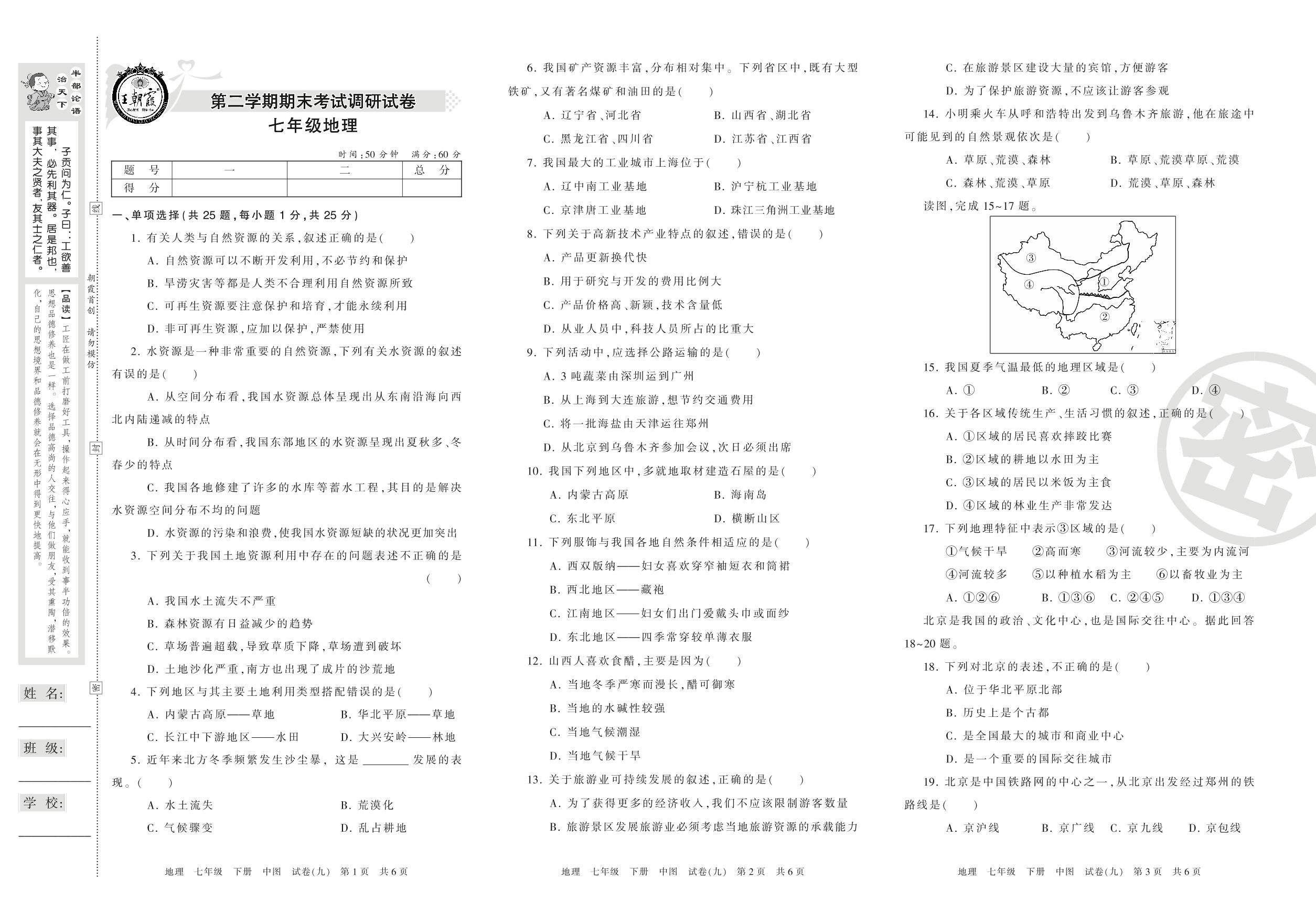 王朝霞期末调研卷七年级下册地理(中图版)_R210810144232【9】