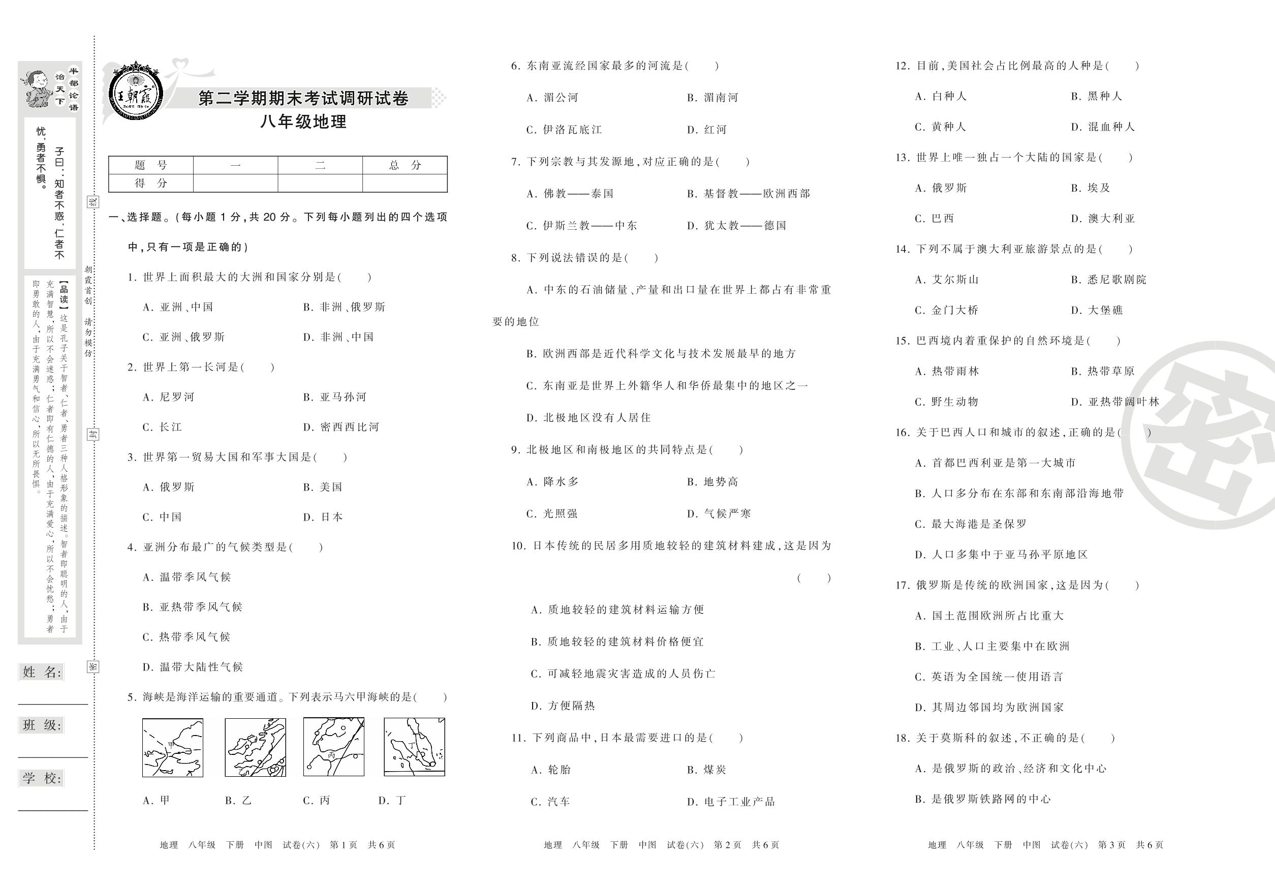 王朝霞期末调研卷八年级下册地理(中图版)【6】