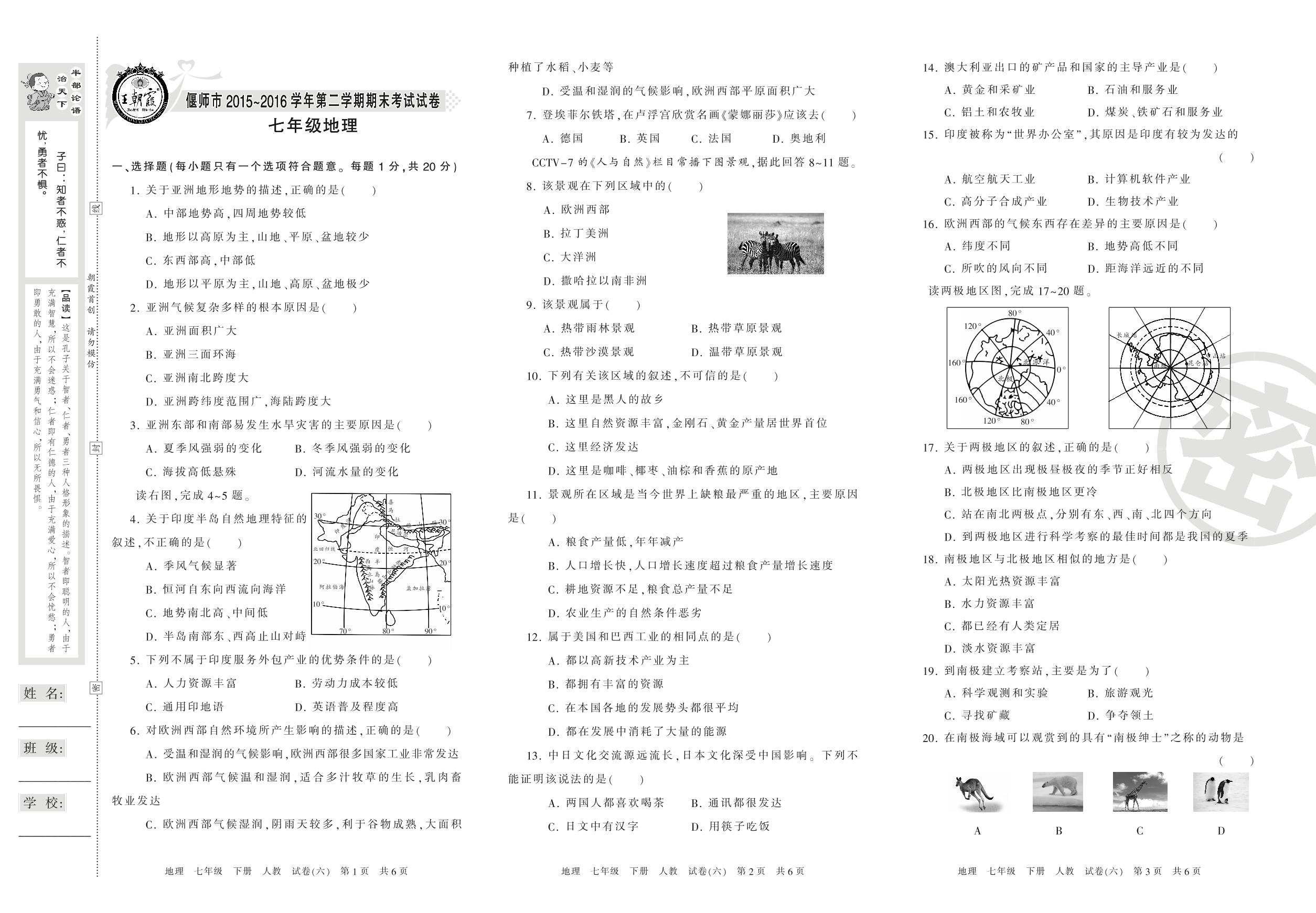 2015-2016学年第二学期偃师市七年级地理试卷(人教版)【6】