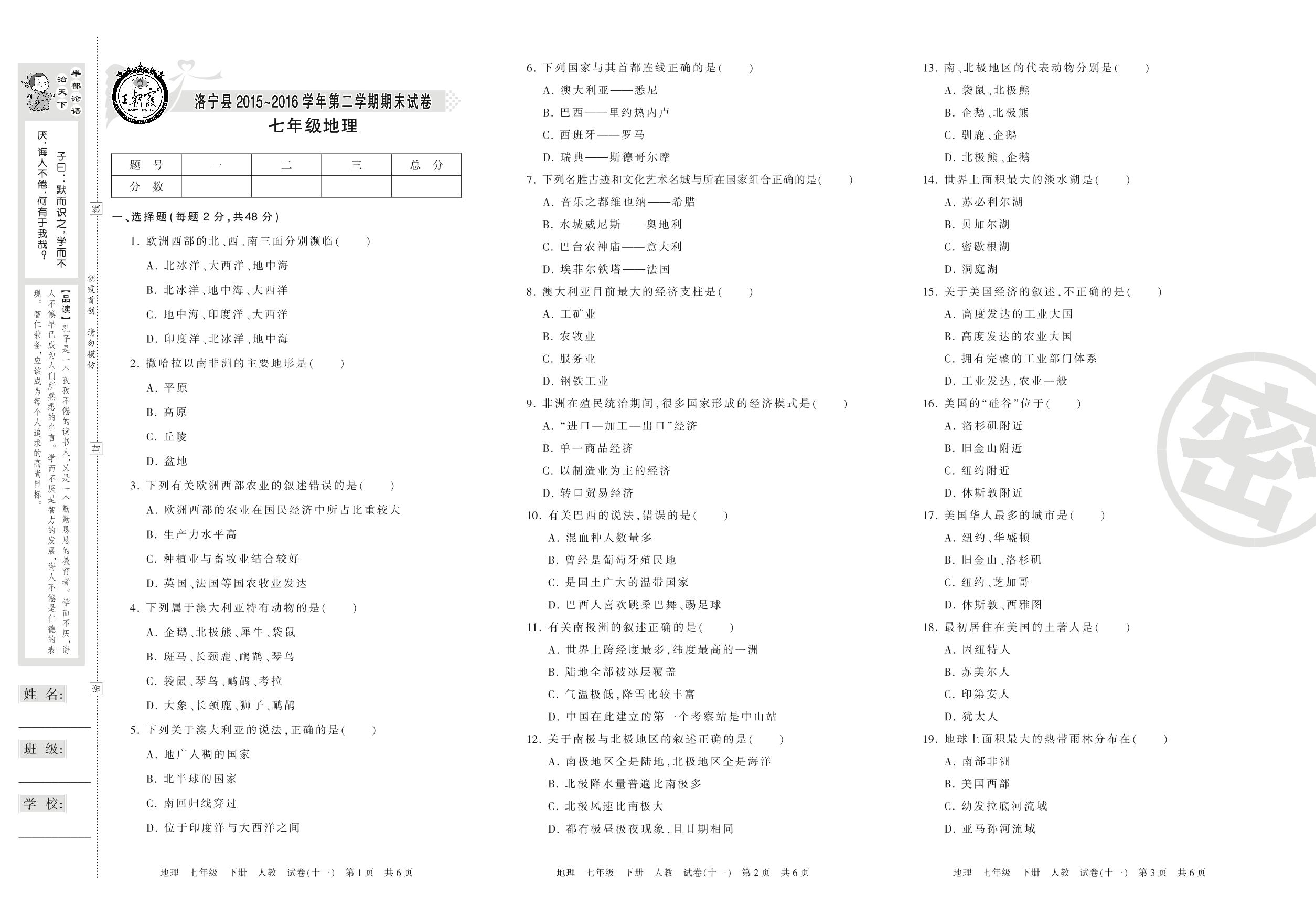 2015-2016学年第二学期洛阳市洛宁县七年级地理试卷(人教版)【11】