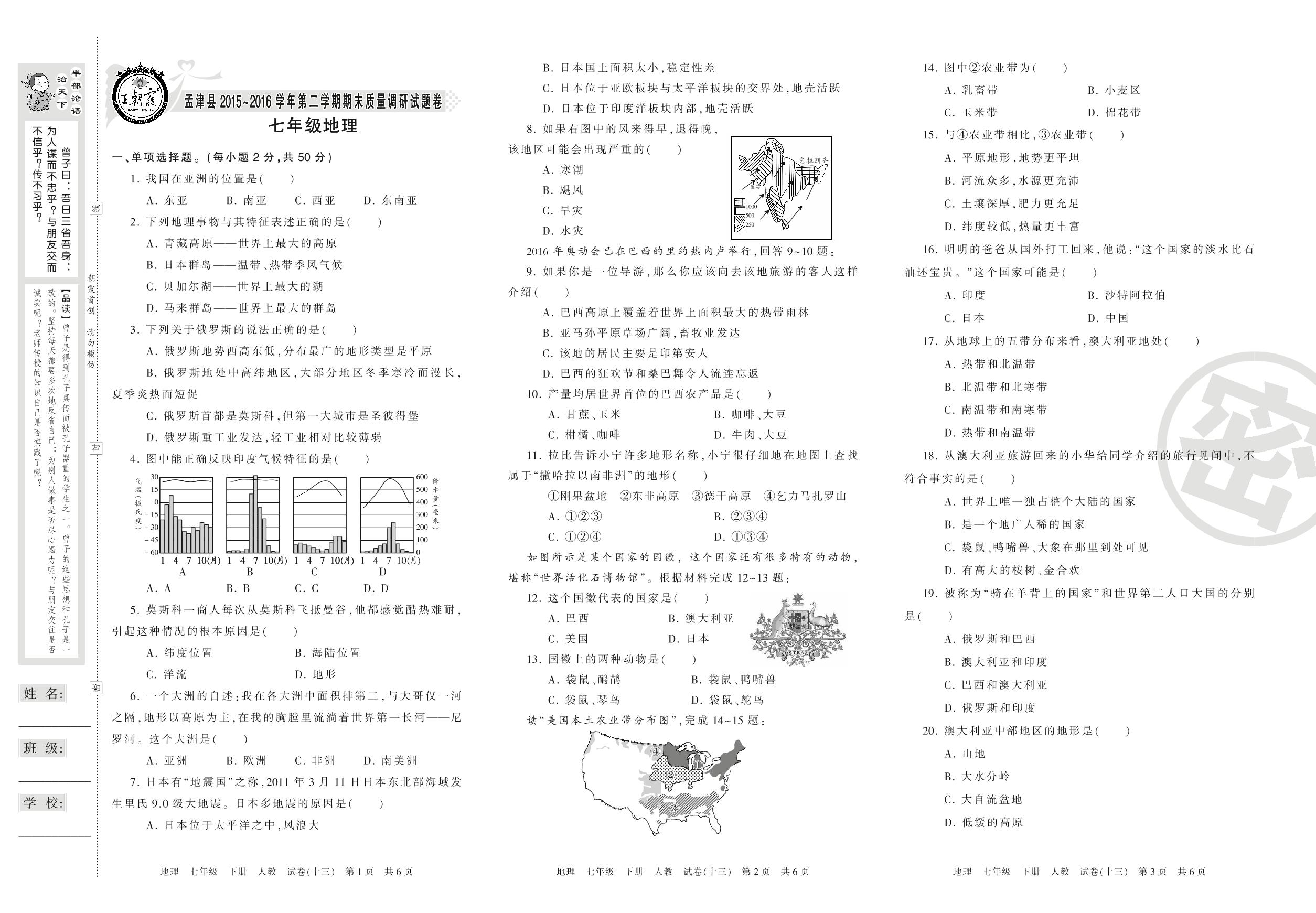 2015-2016学年第二学期洛阳市孟津县七年级地理试卷(人教版)【13】