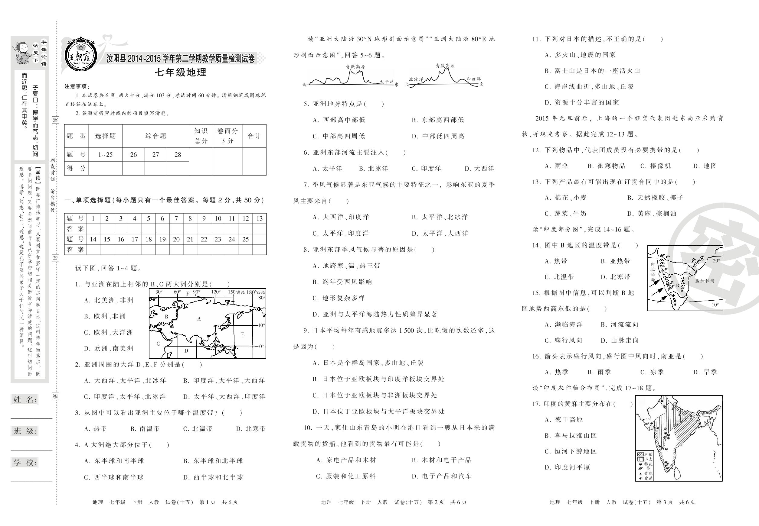 2015-2016学年第二学期洛阳市汝阳县七年级地理试卷(人教版)【15】