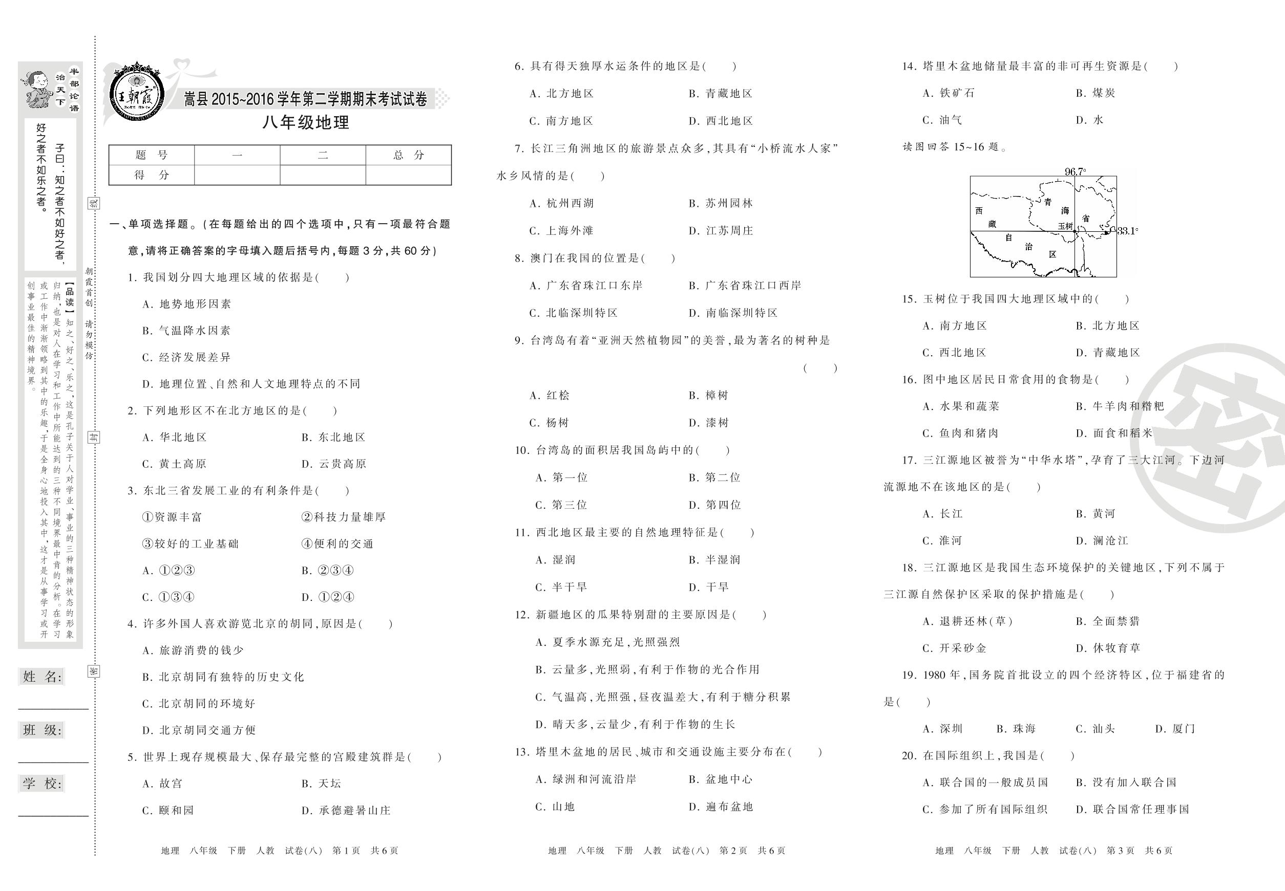 2015-2016学年第二学期洛阳市嵩县八年级地理试卷(人教版)【8】