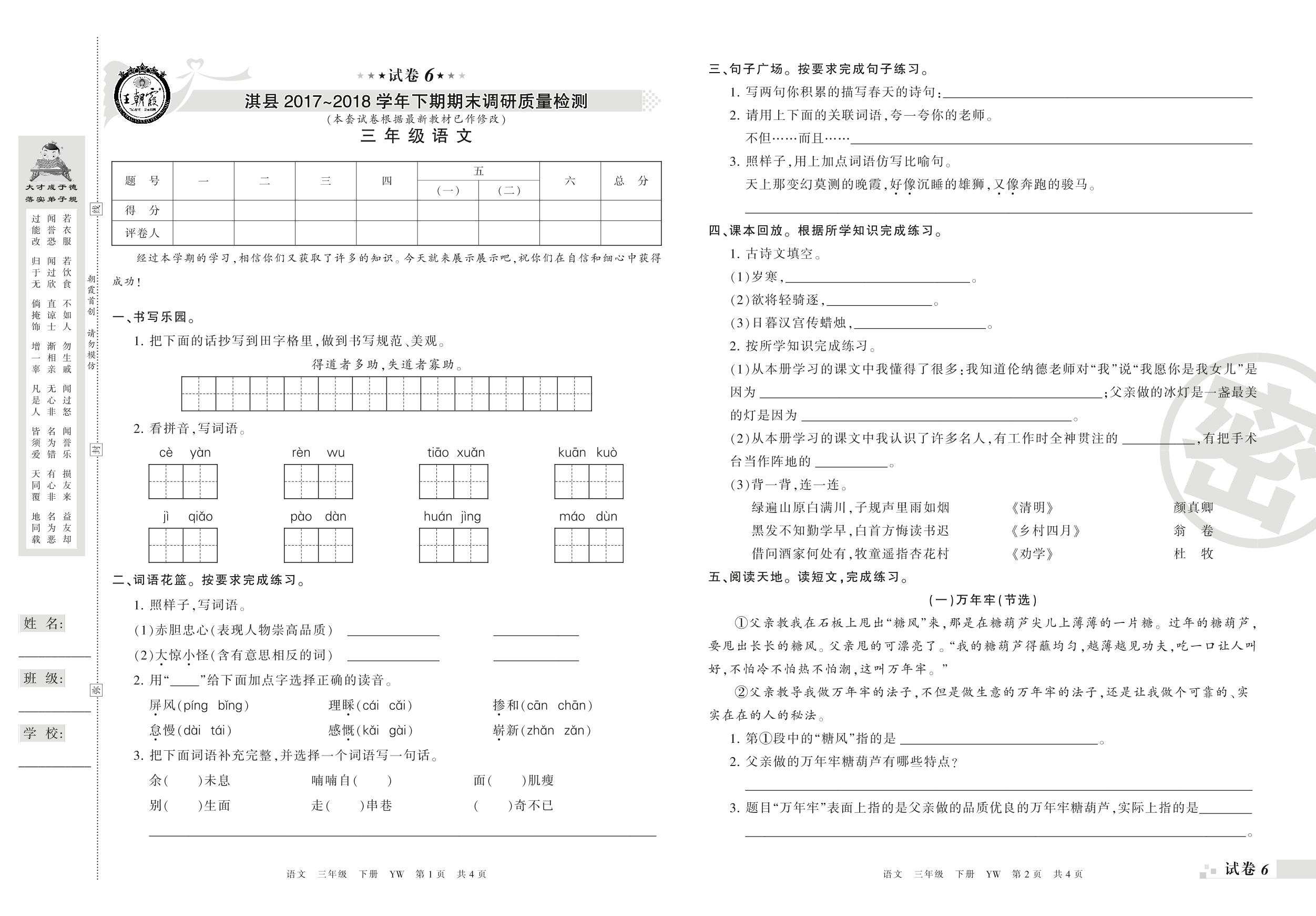 2017-2018学年第二学期鹤壁市淇县三年级语文试卷(语文版)【6】