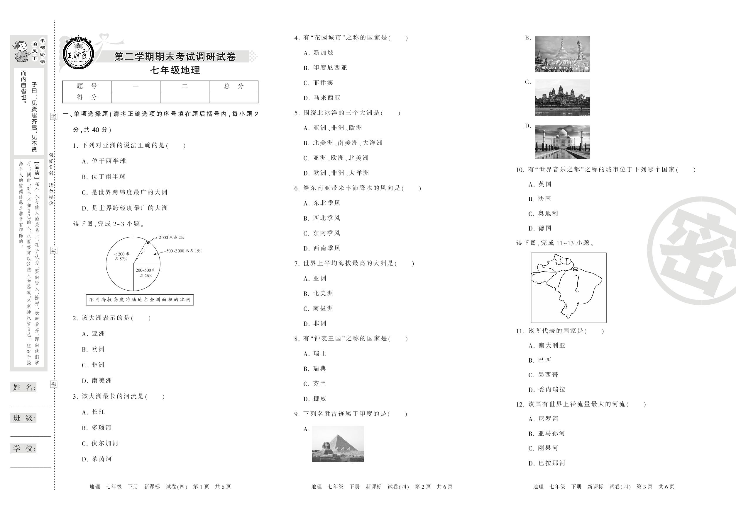 调研试卷七年级下册地理(新课版)【4】