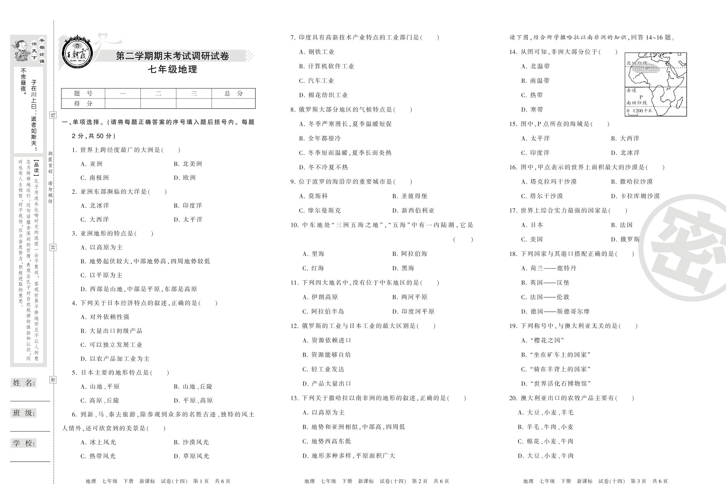 调研试卷七年级下册地理(新课版)【14】