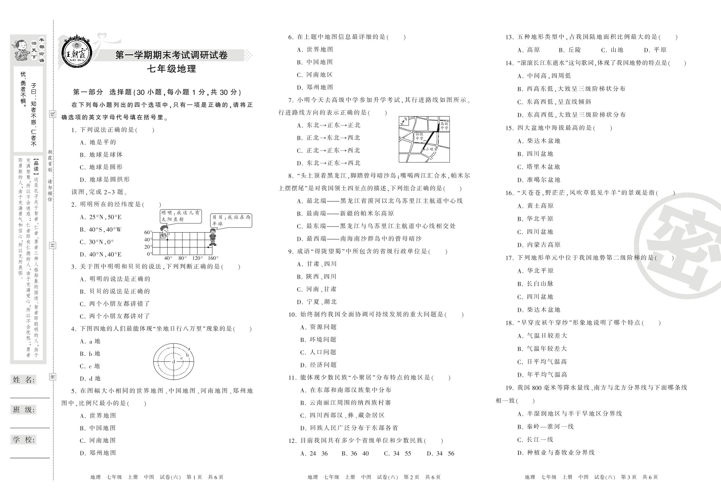 王朝霞期末调研卷七年级上册地理(中图版)【6】