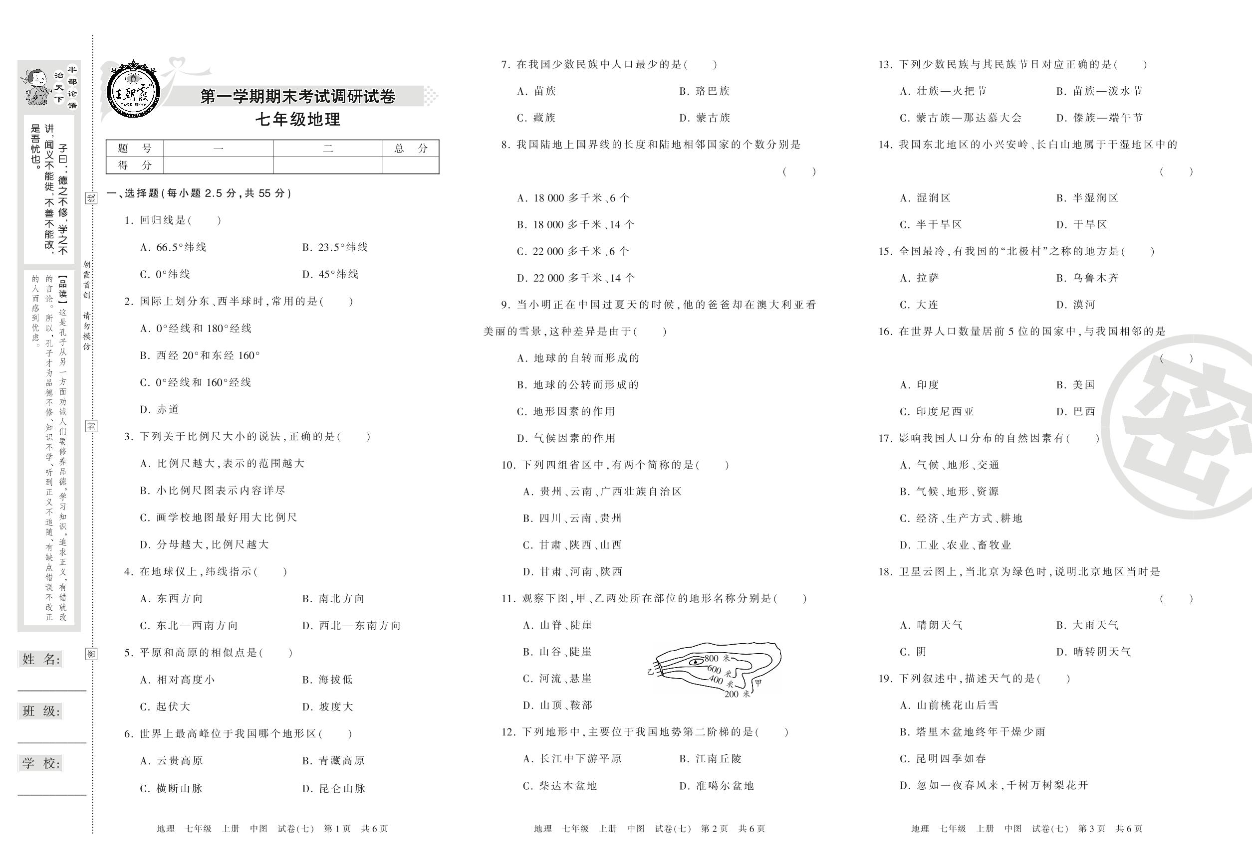 王朝霞期末调研卷七年级上册地理(中图版)【7】