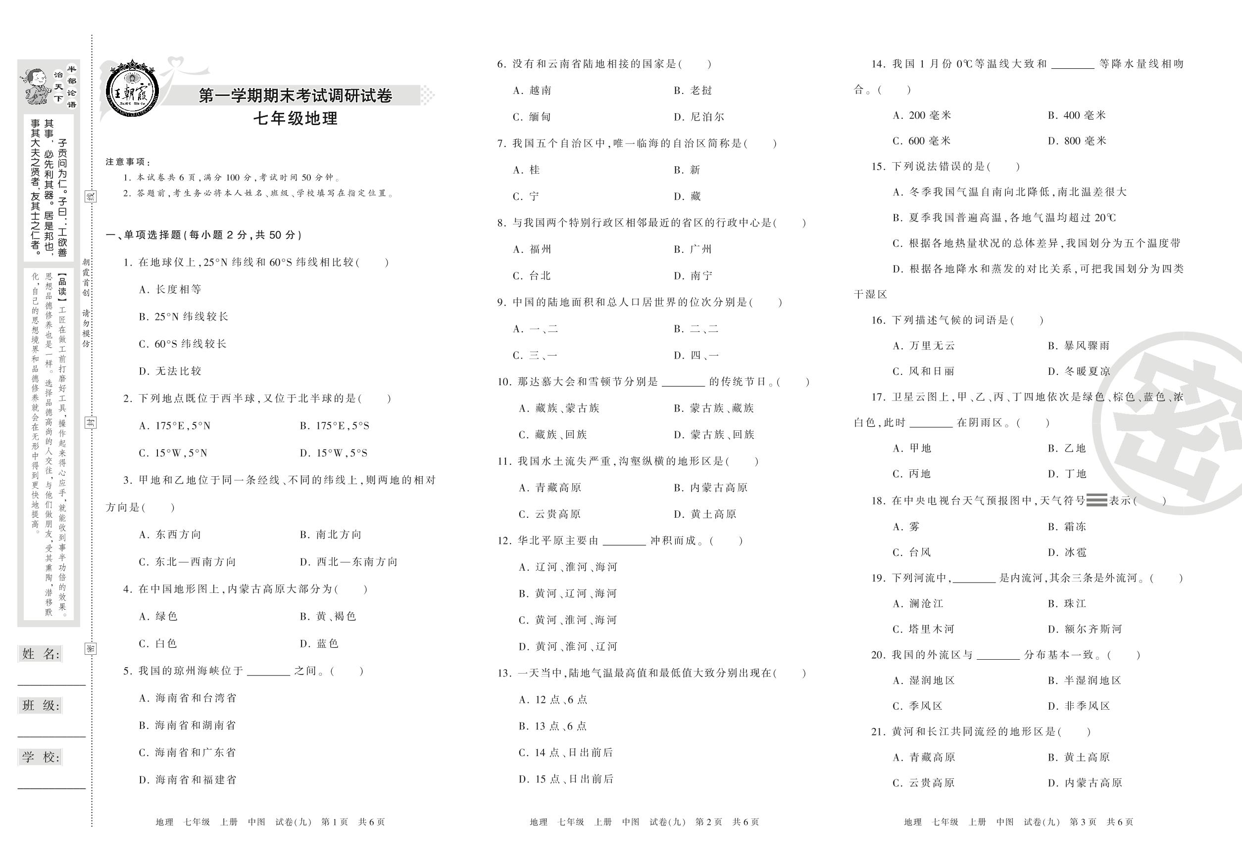 王朝霞期末调研卷七年级上册地理(中图版)【9】