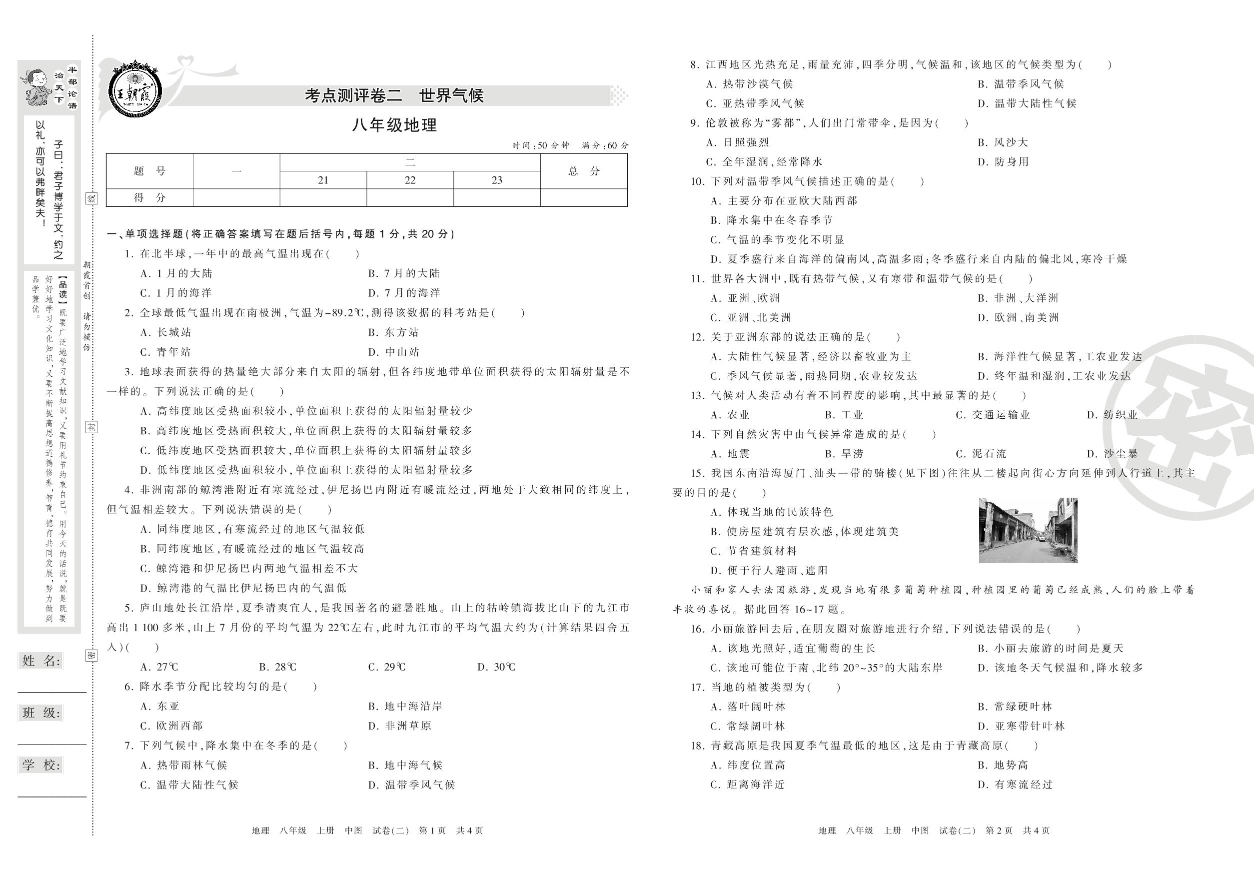 王朝霞期末测评卷八年级上册地理(中图版)【2】