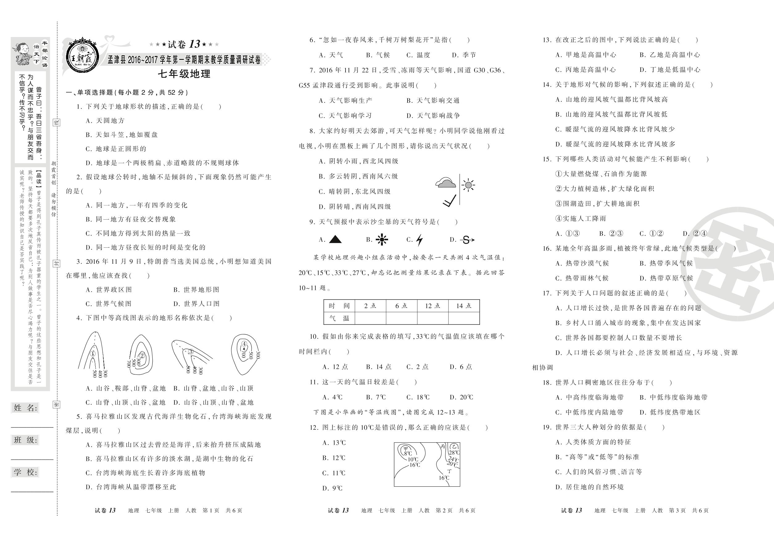 2016-2017学年第一学期洛阳市孟津县七年级地理试卷(人教版)【13】