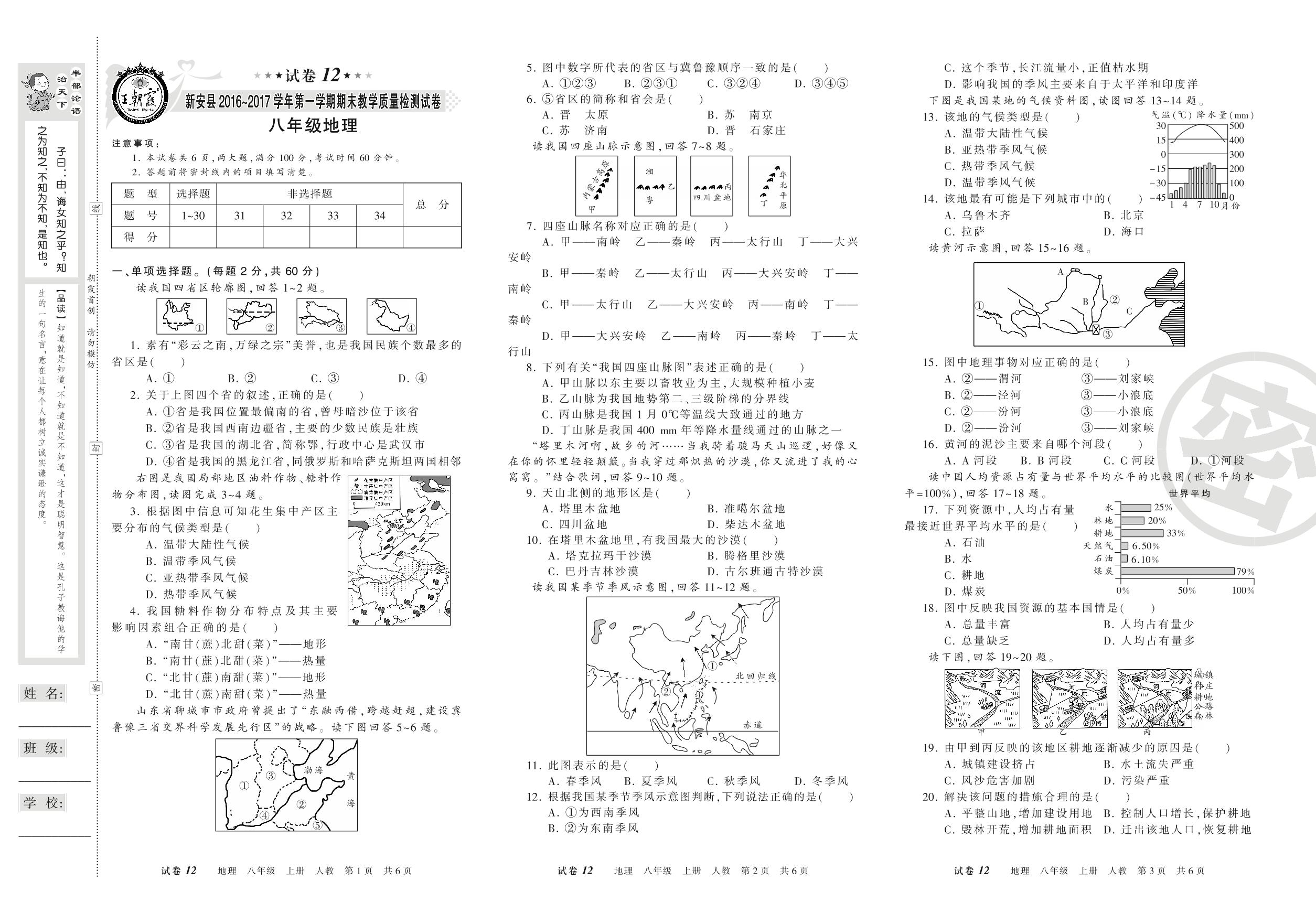 2016-2017学年第一学期新安县八年级地理试卷(人教版)【12】