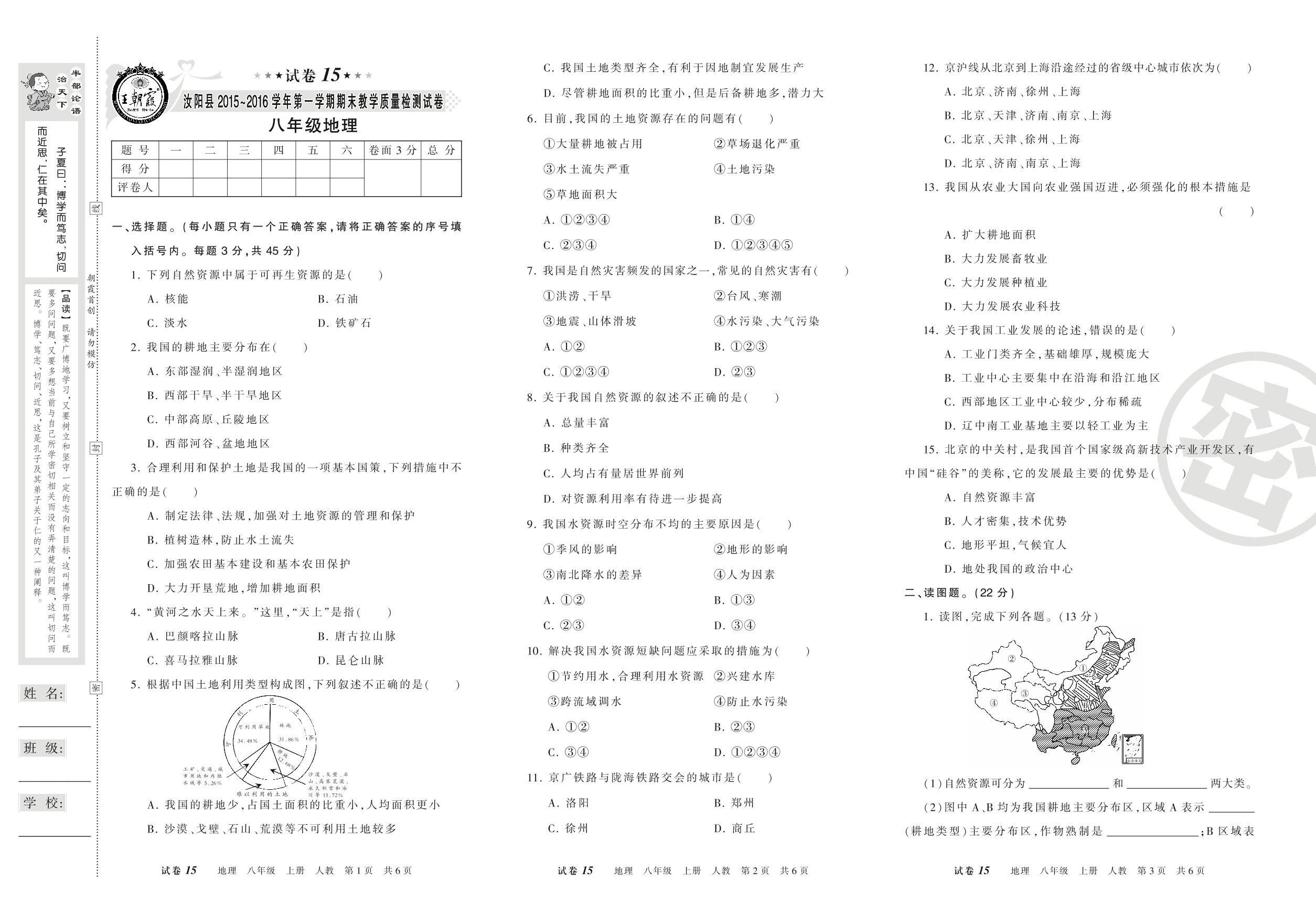 2015-2016学年第一学期洛阳市汝阳县八年级地理试卷(人教版)【15】