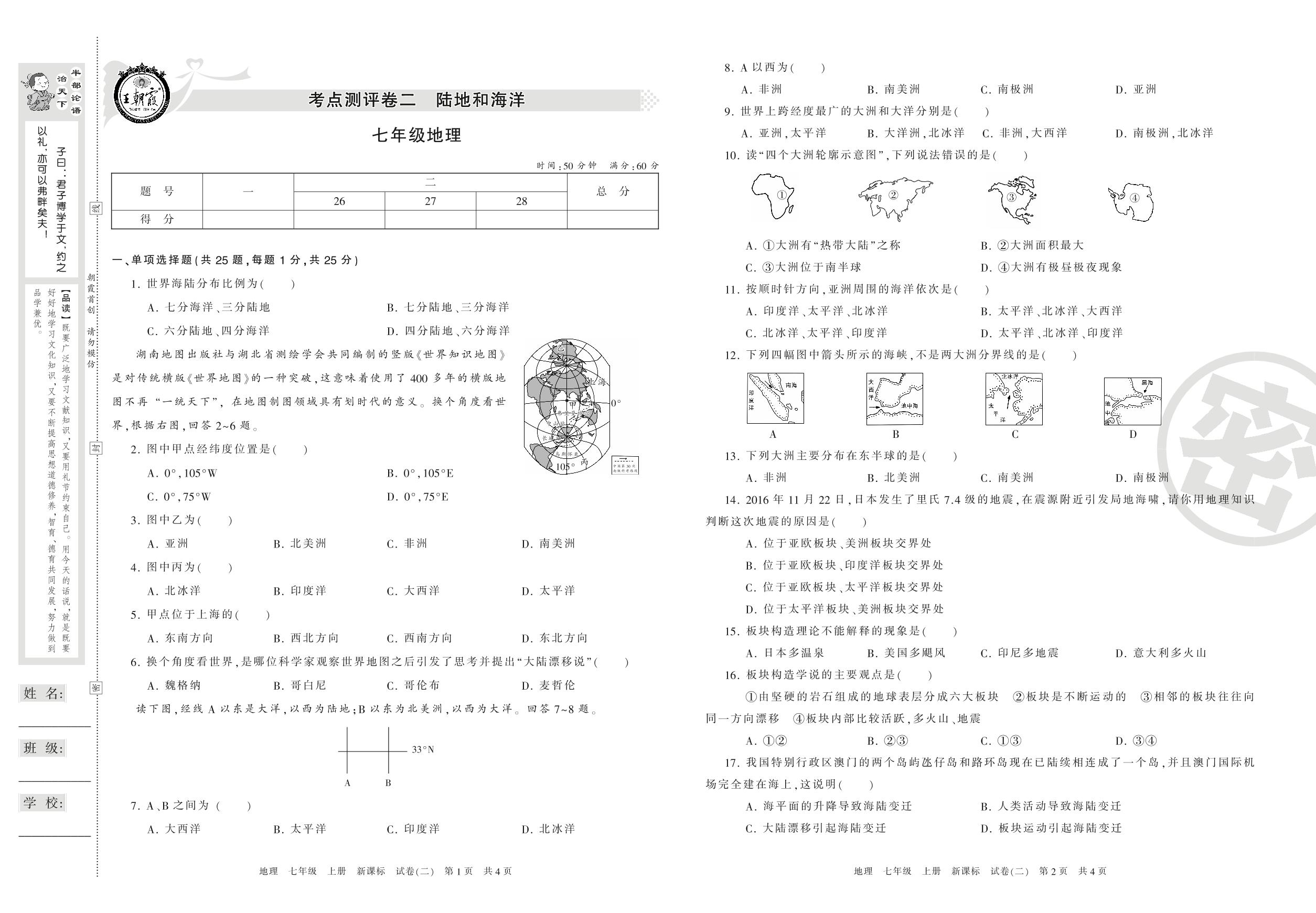 王朝霞期末测评卷七年级上册地理(新课版)【2】