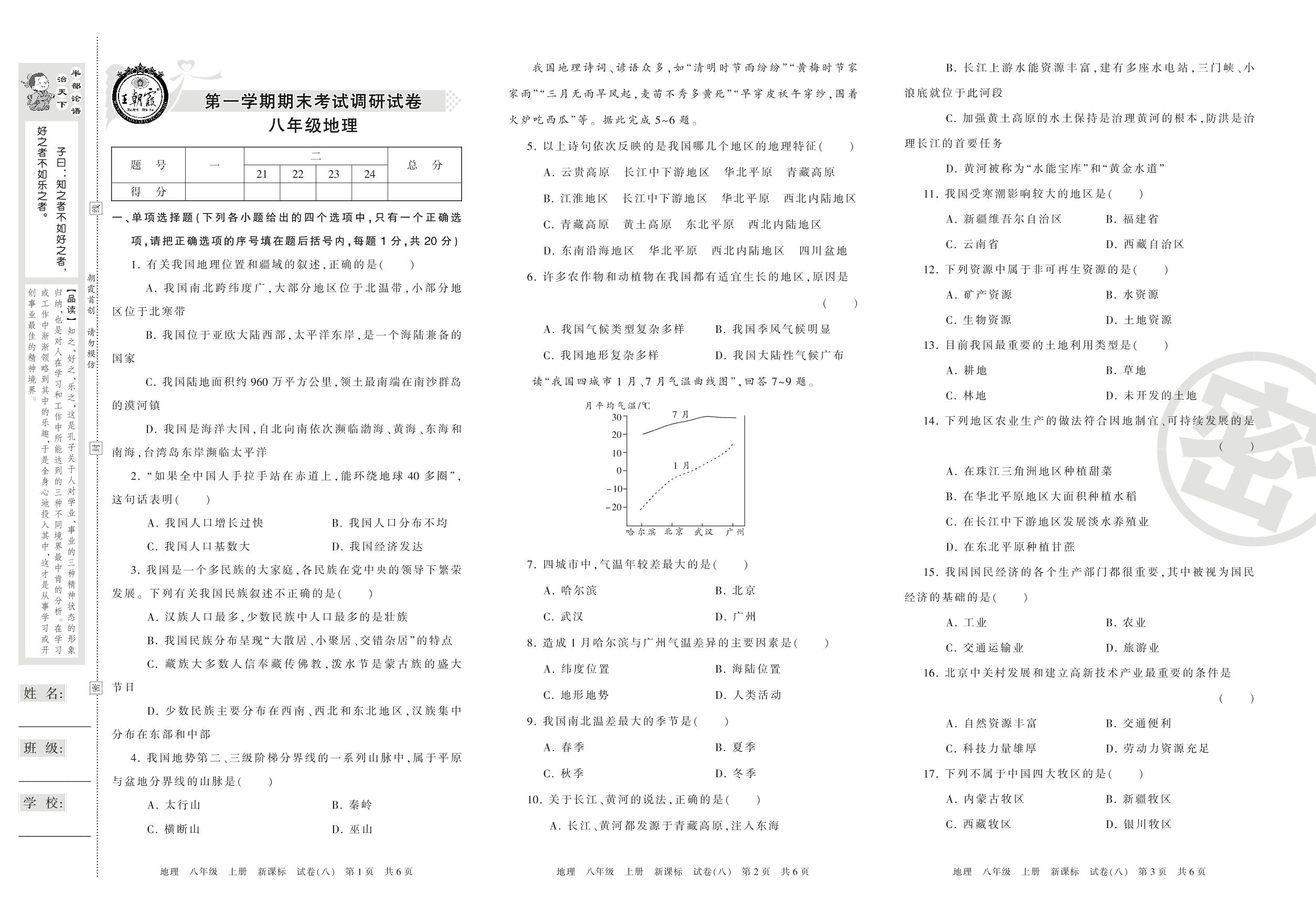 王朝霞期末调研卷八年级上册地理(新课版)【8】