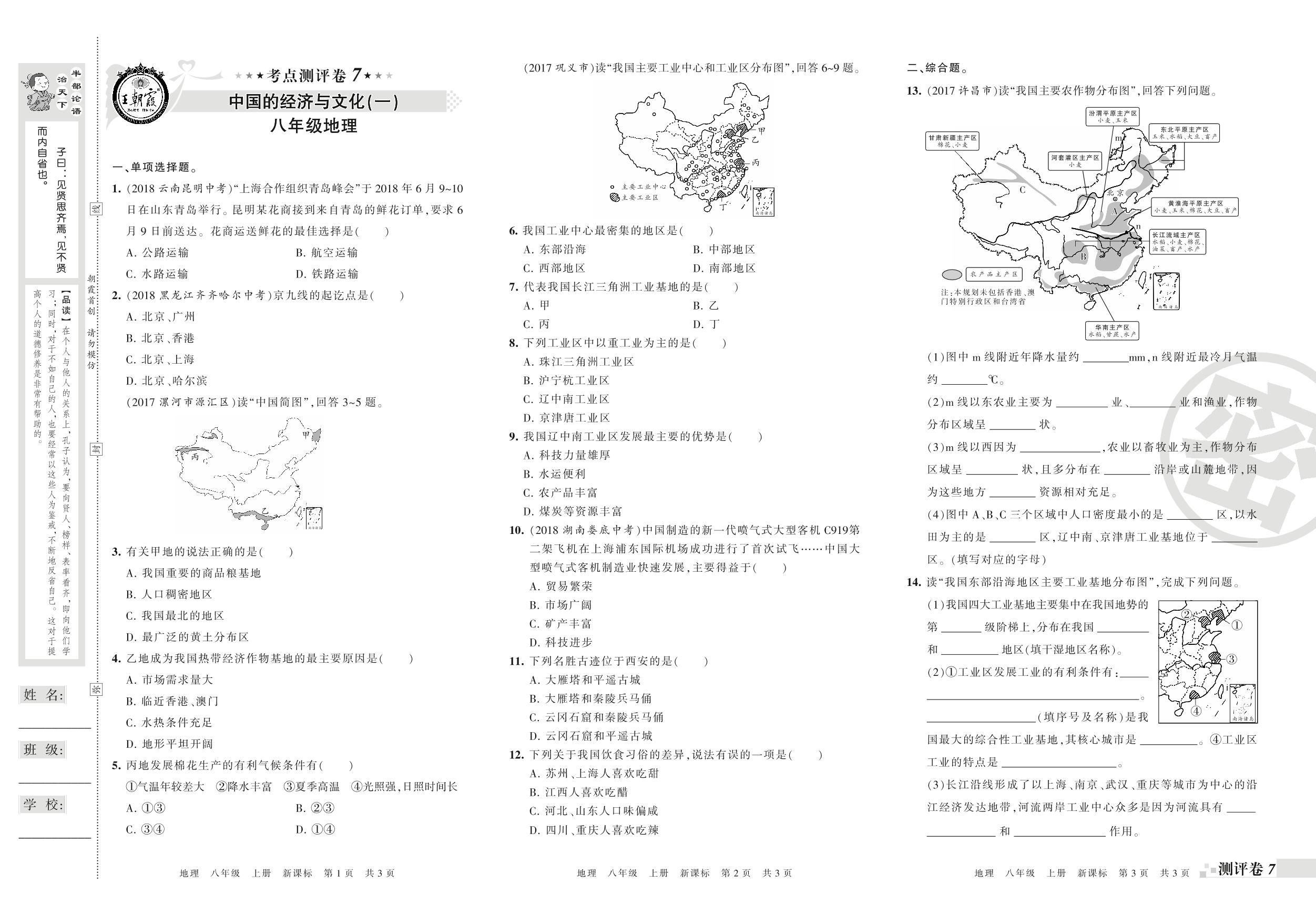 王朝霞期末测评卷——中国的经济与文化(一)(二)八年级上册地理(新课版)_R210810150009【0】