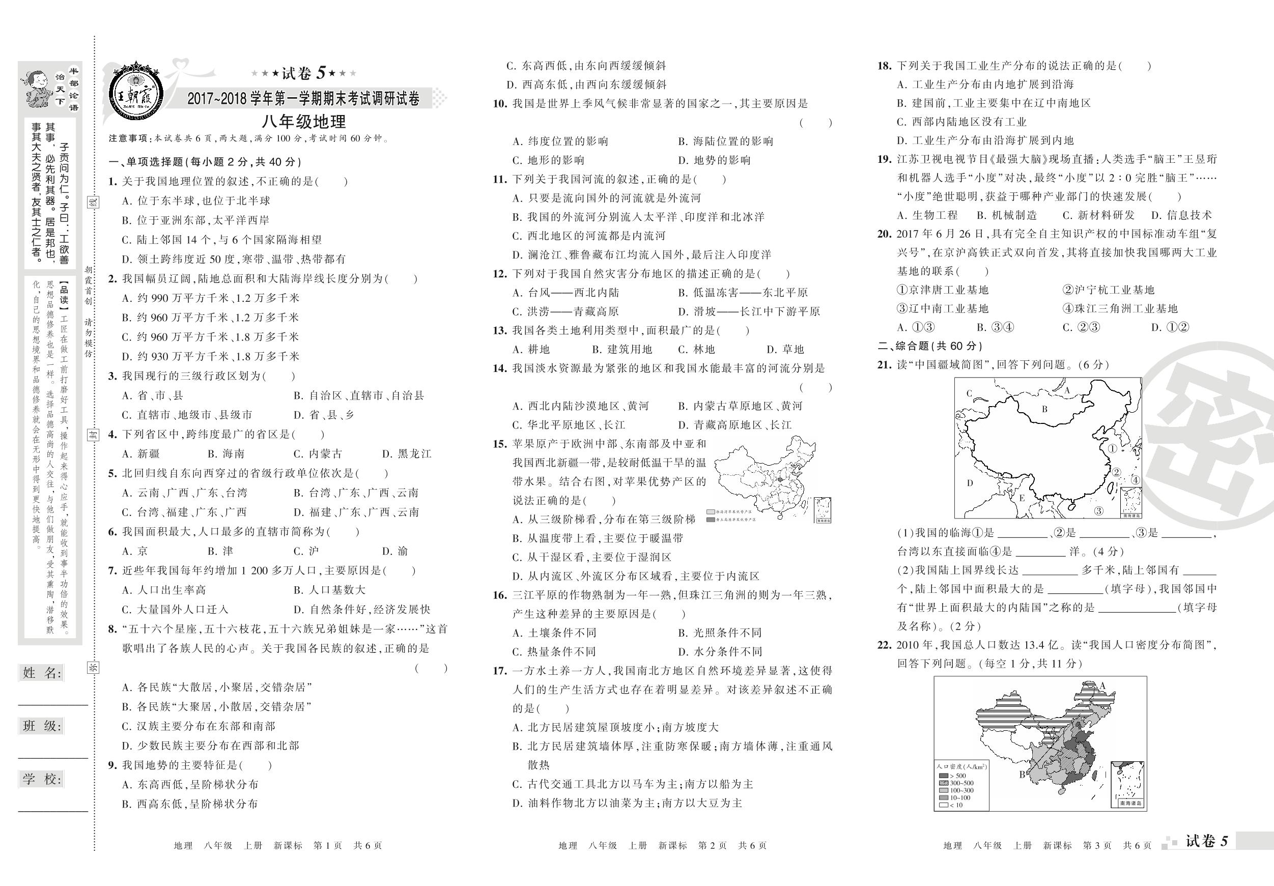 八年级地理新课标版上册期末卷