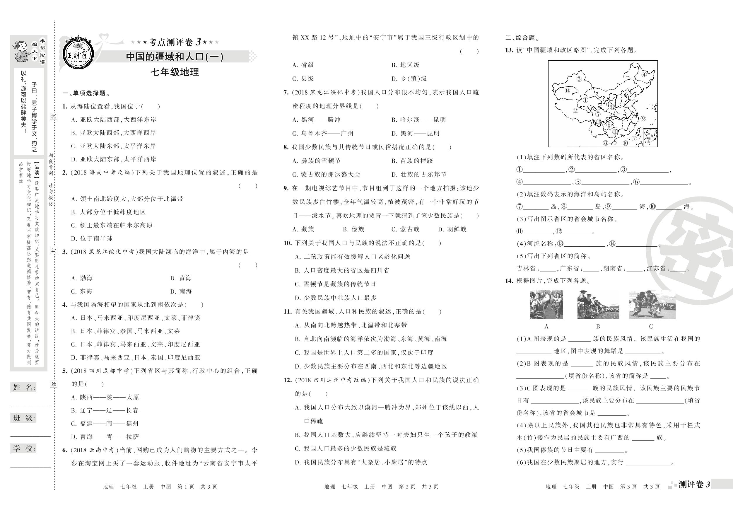 王朝霞期末测评卷——中国的疆域和人口(一)(二)七年级上册地理(中图版)_R210810150149【0】
