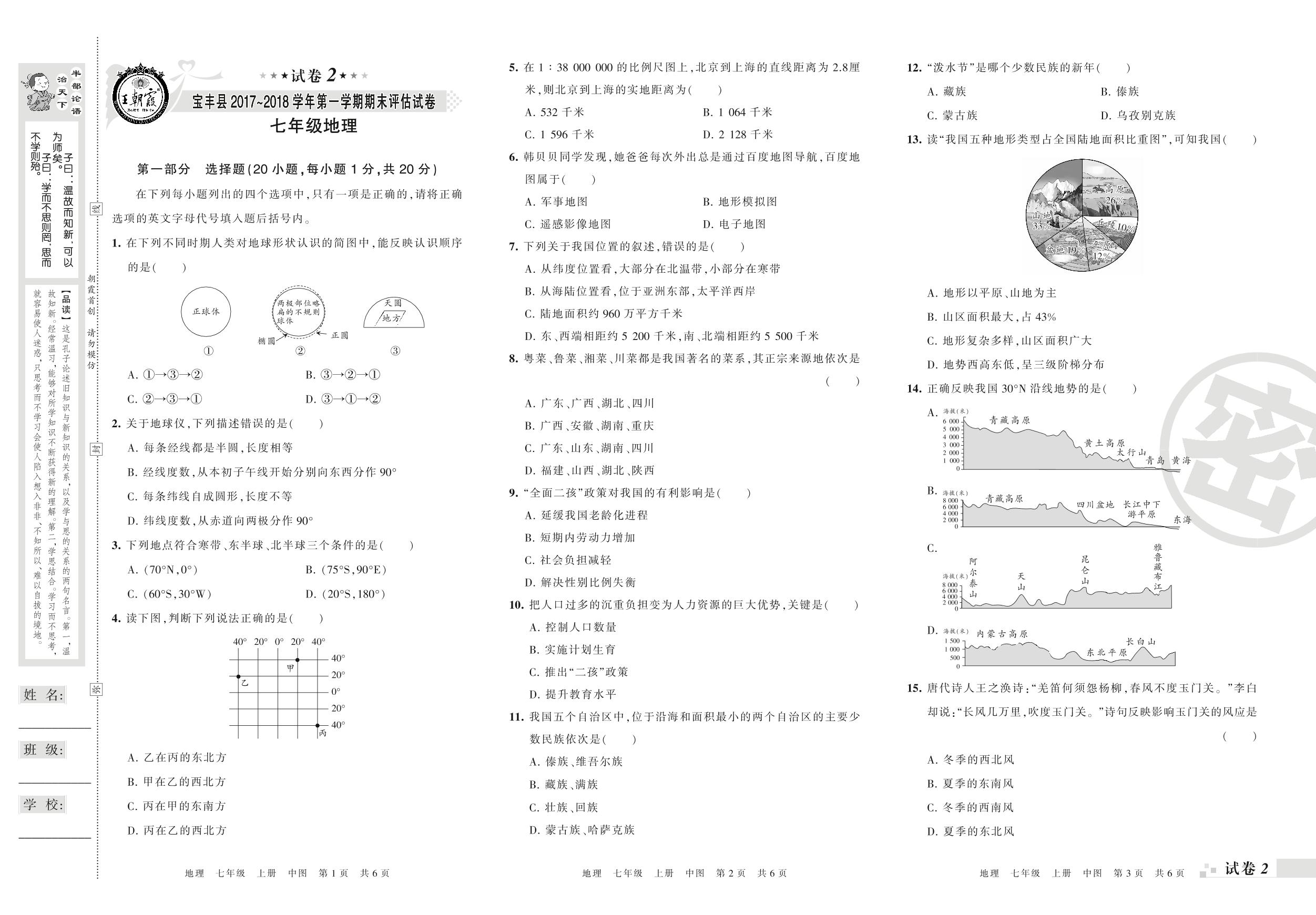 2017-2018学年第一学期平顶山市宝丰县七年级地理试卷(中图版)【2】