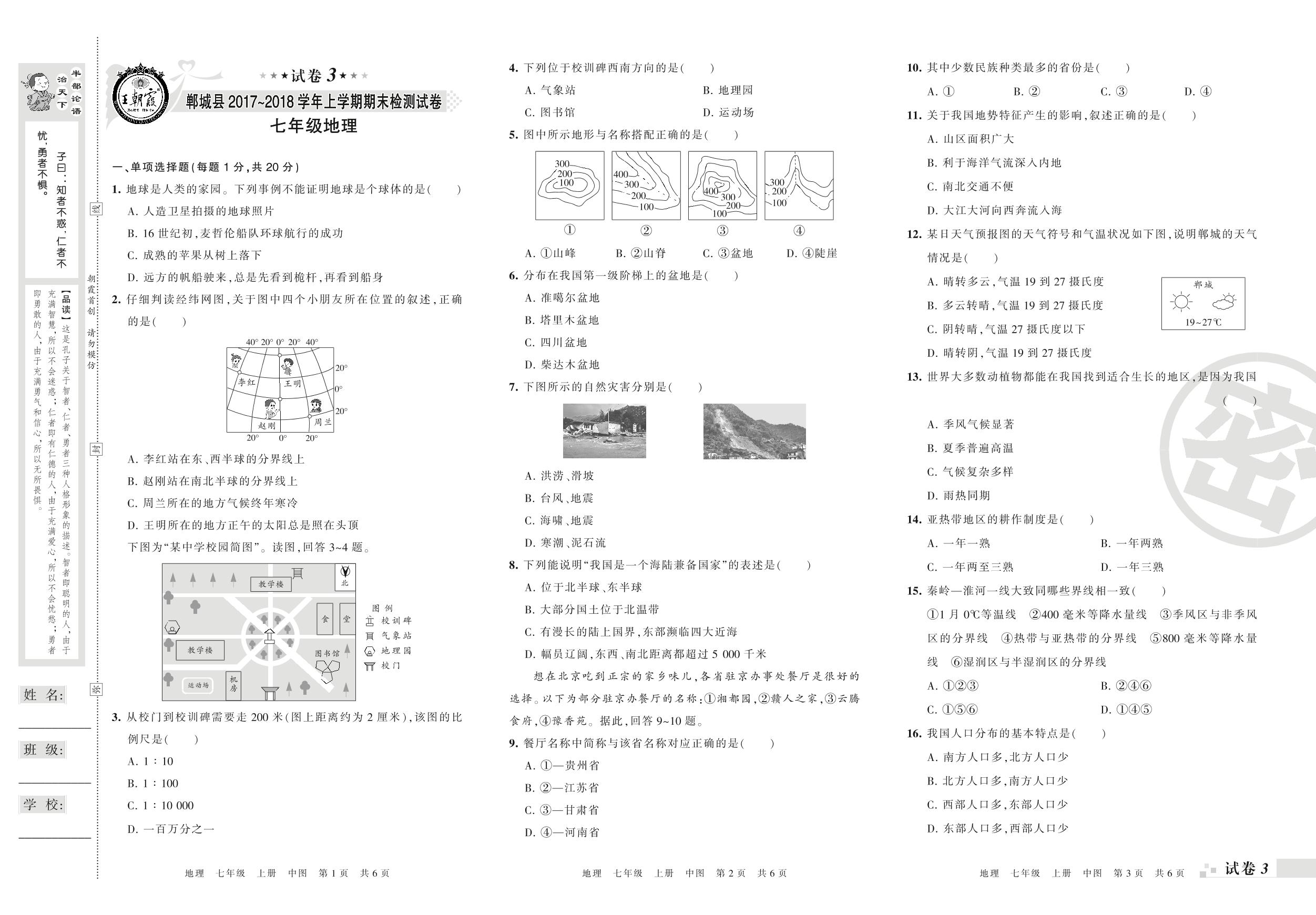 2017-2018学年第一学期周口市郸城县七年级地理试卷(中图版)【3】