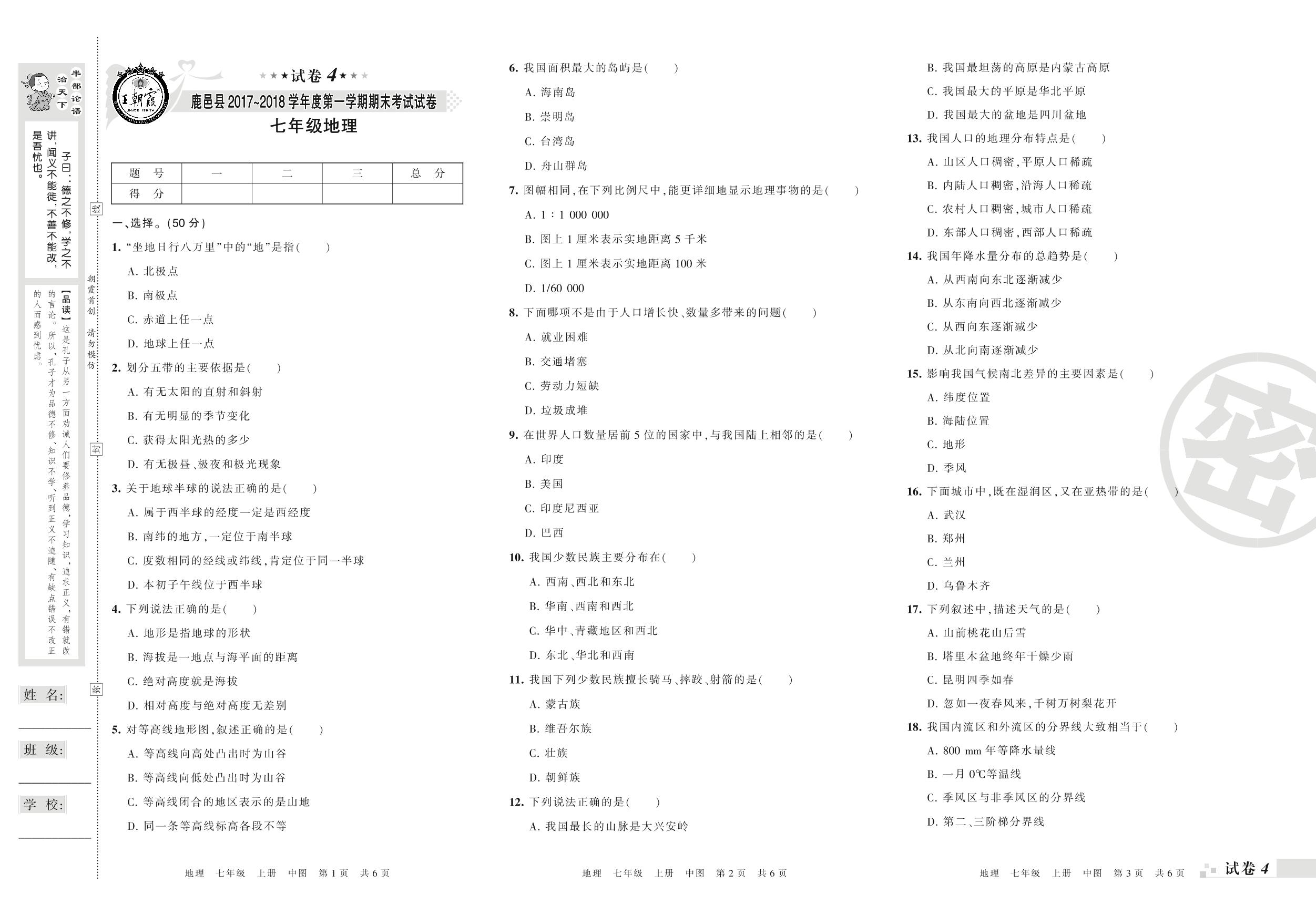 2017-2018学年第一学期周口市鹿邑县七年级地理试卷(中图版)【4】