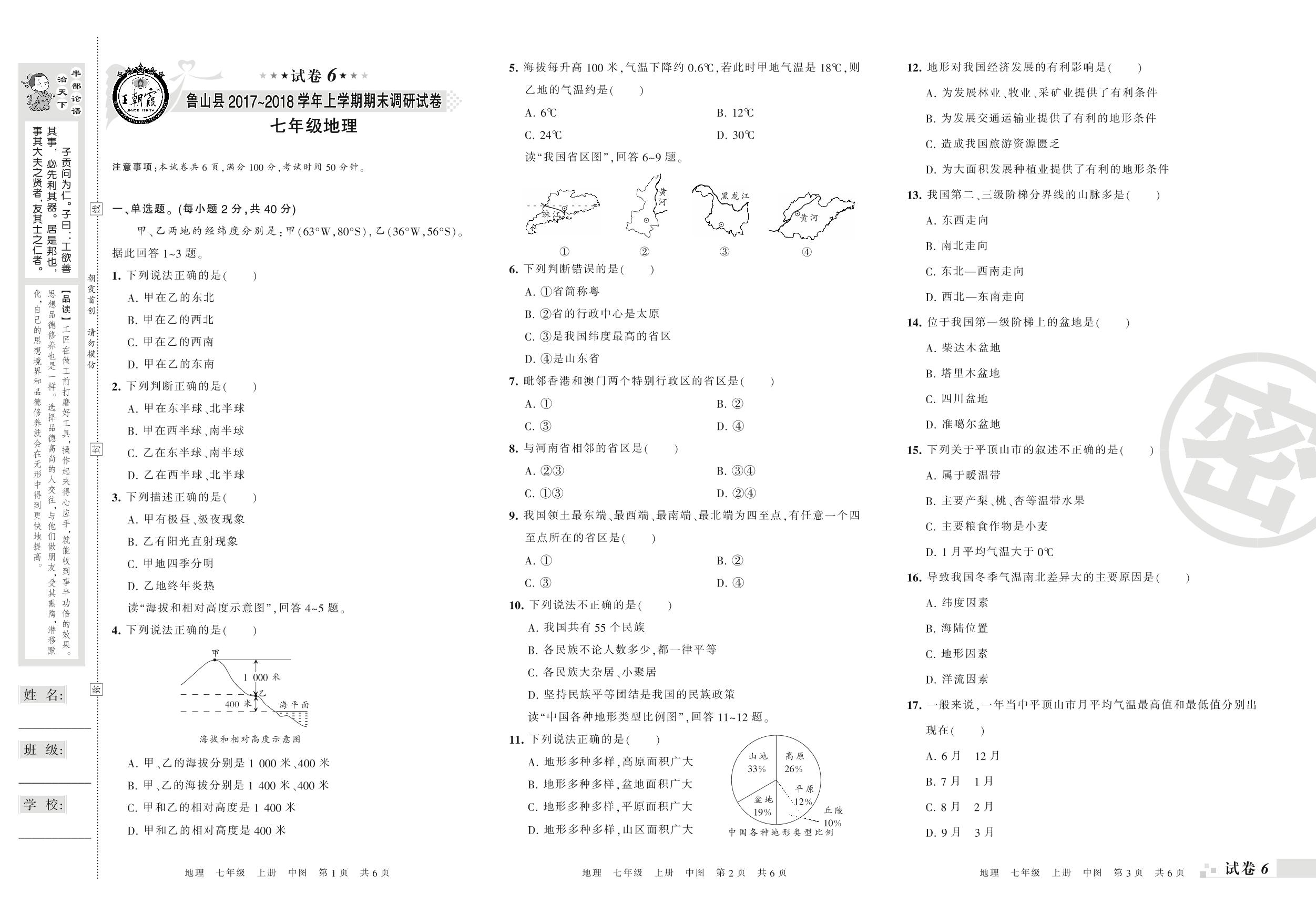 2017-2018学年第一学期平顶山市鲁山县七年级地理试卷(中图版)【6】
