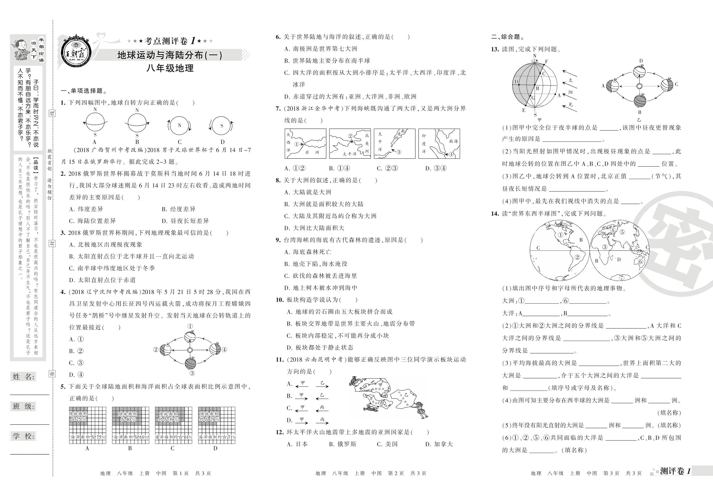 王朝霞期末测评卷——地球运动与海陆分布(一)(二)八年级上册地理(中图版)_R210810150404【0】