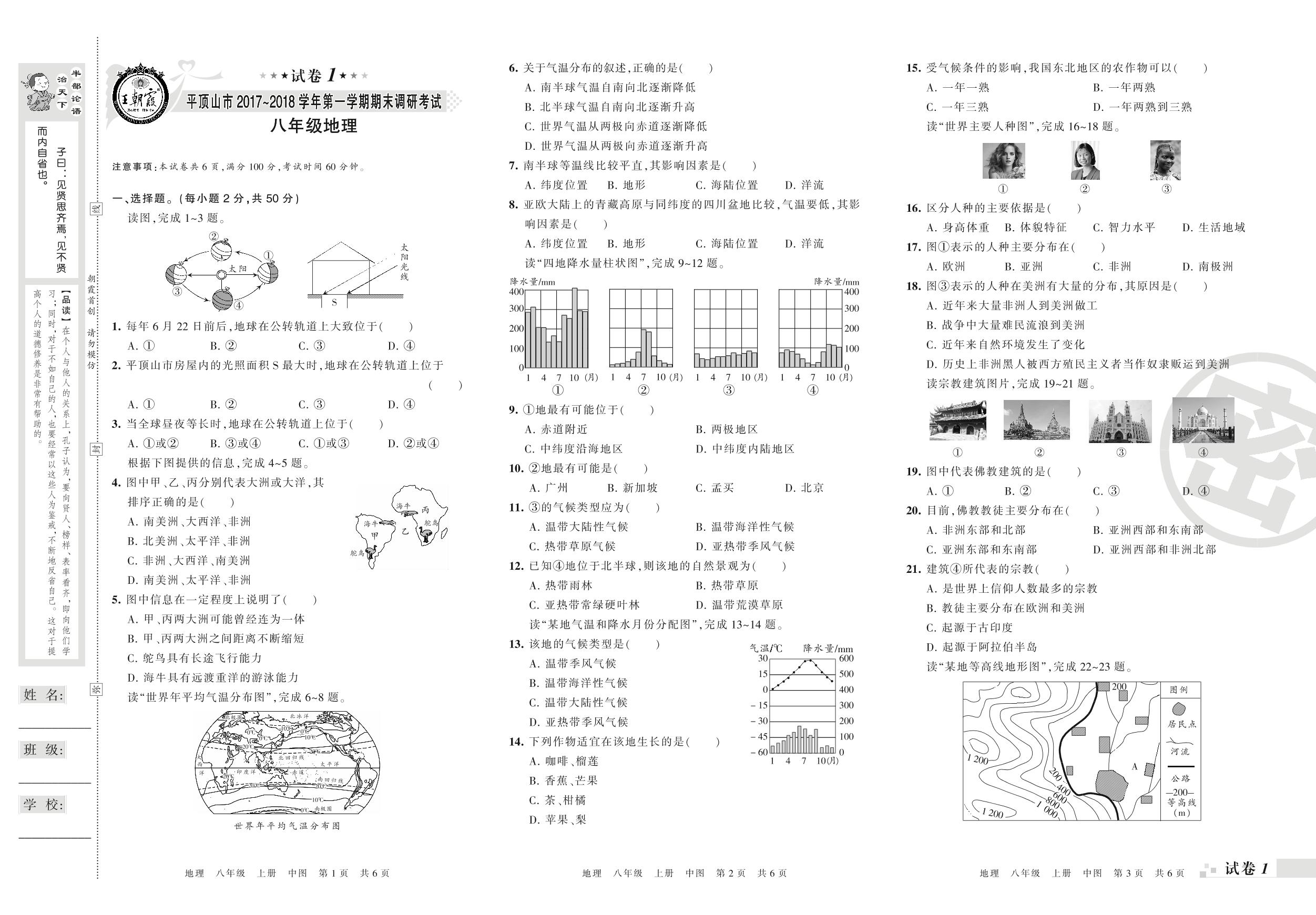 2017-2018学年第一学期平顶山市八年级地理试卷(中图版)【1】