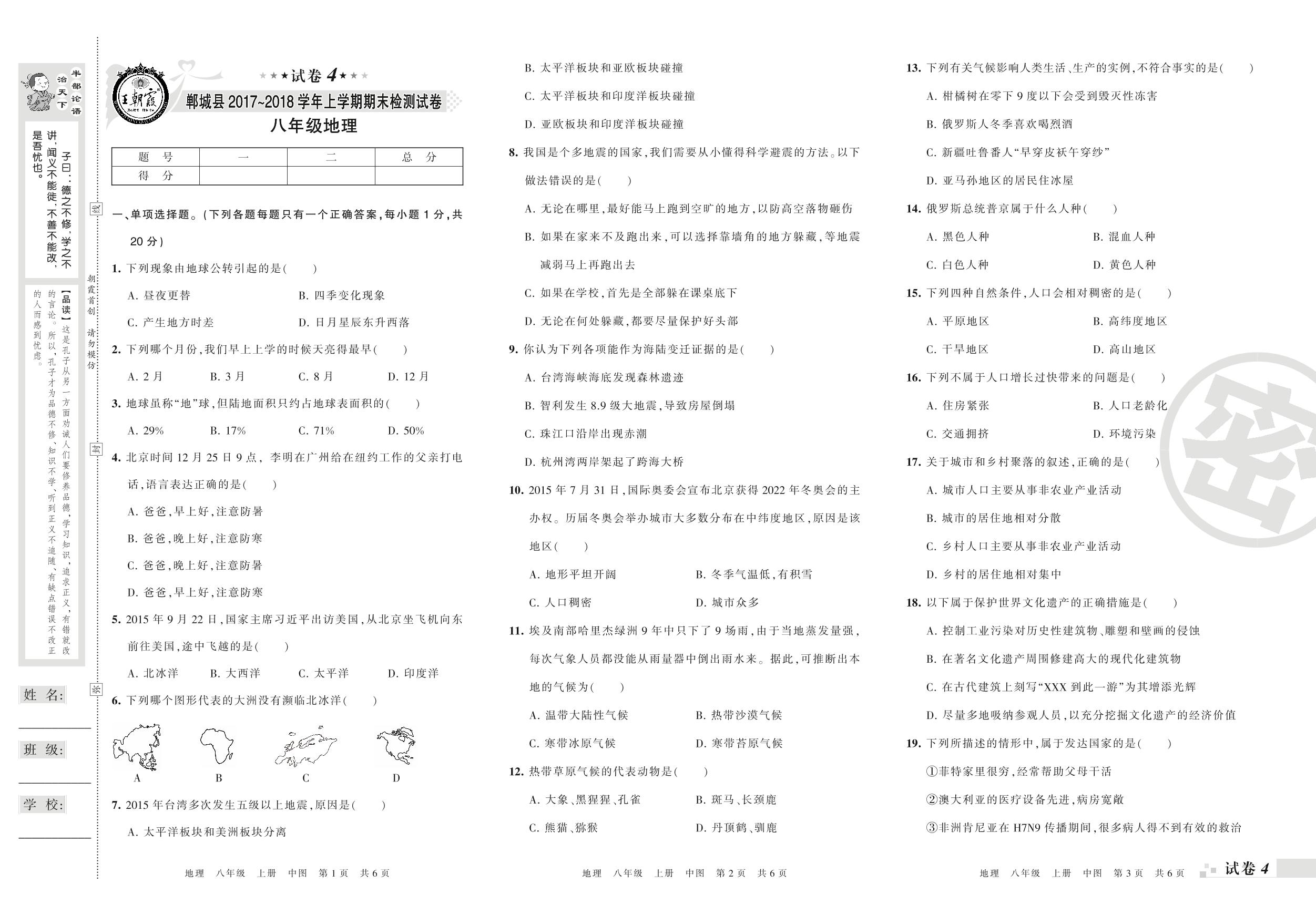 2017-2018学年第一学期周口市郸城县八年级地理试卷(中图版)【4】