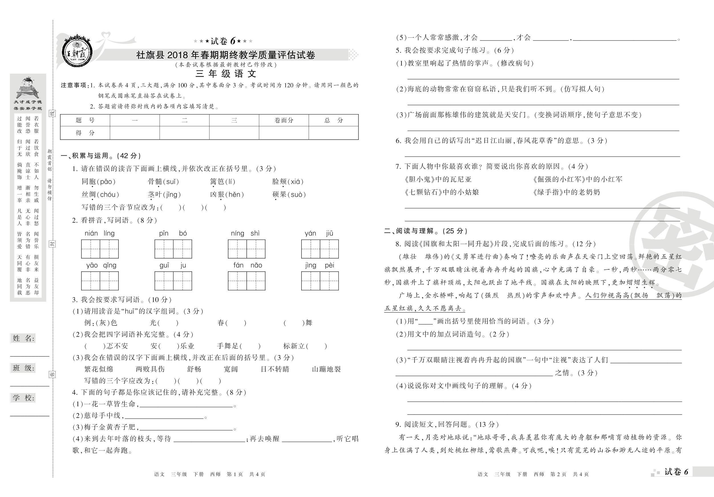 2017-2018学年第二学期南阳市社旗县三年级语文试卷(西师版)【6】
