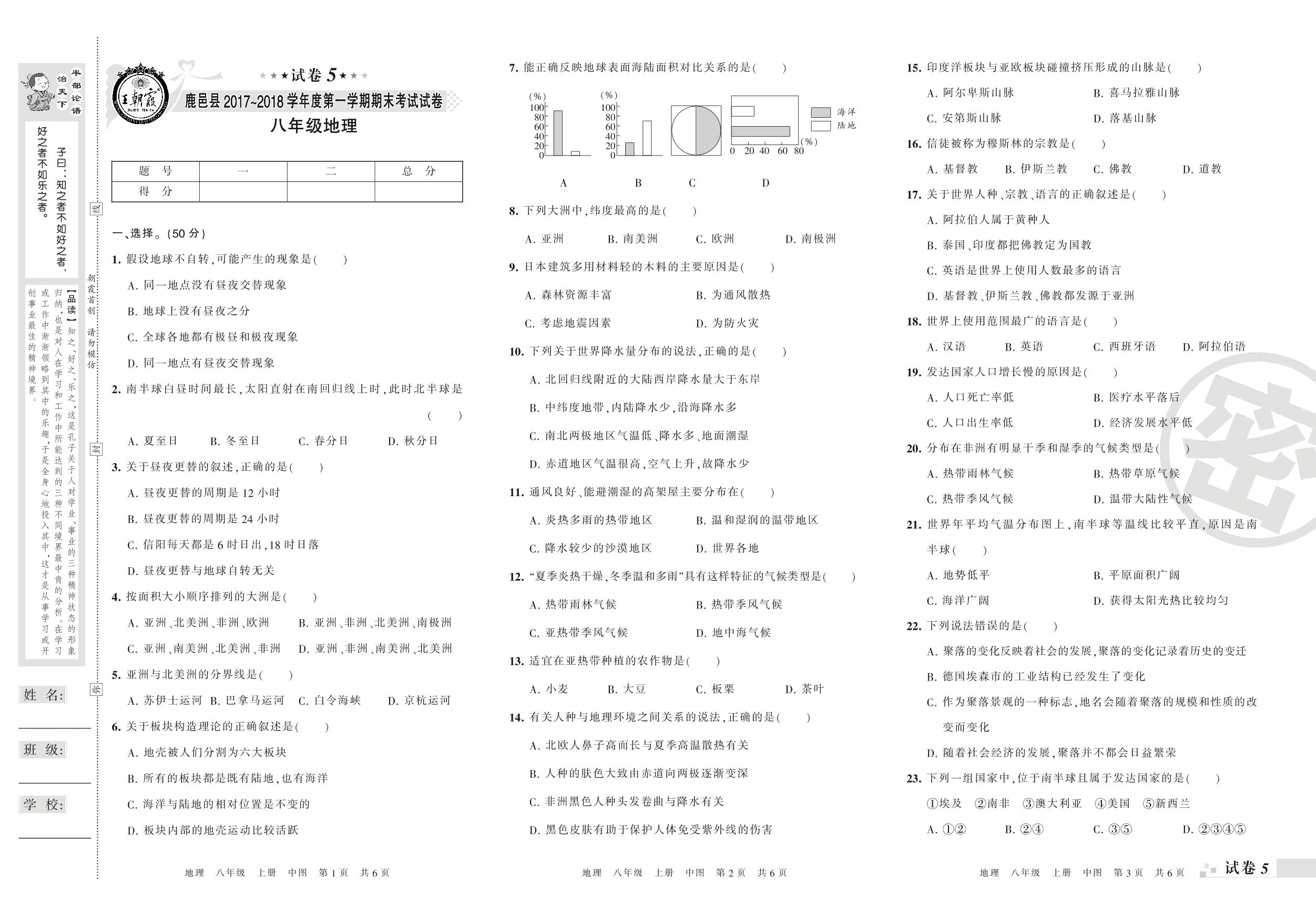 2017-2018学年第一学期周口市鹿邑县八年级地理试卷(中图版)【5】