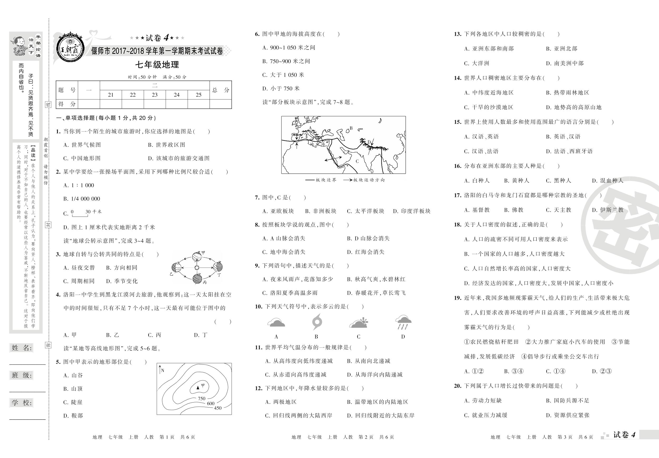 2017-2018学年第一学期偃师市七年级地理试卷(人教版)【4】