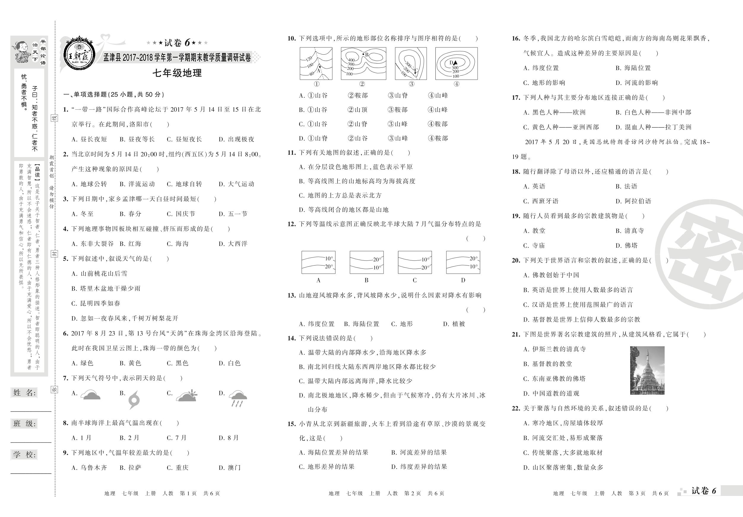 2017-2018学年第一学期洛阳市孟津县七年级地理试卷(人教版)【6】
