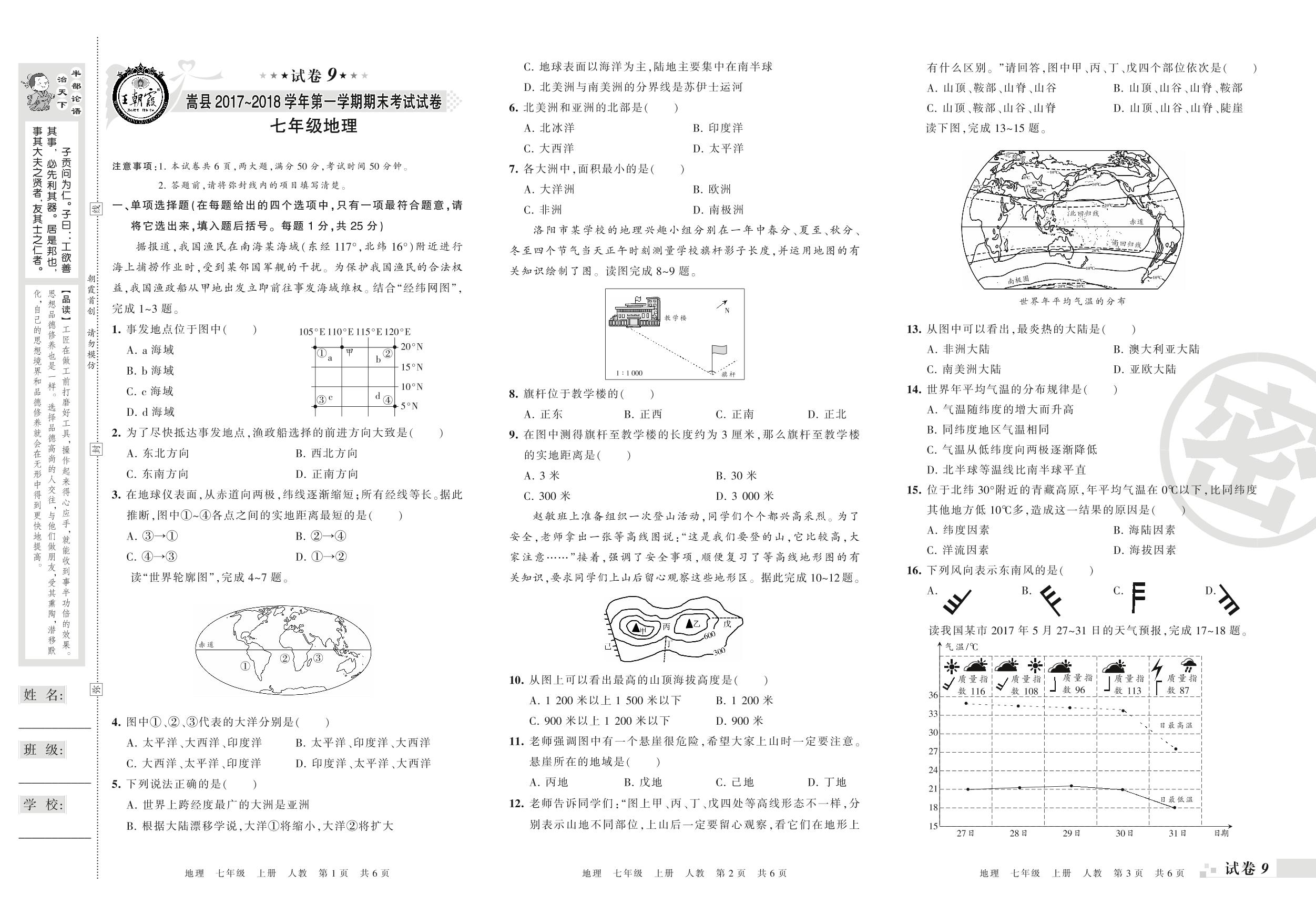 2017-2018学年第一学期洛阳市嵩县七年级地理试卷(人教版)【9】