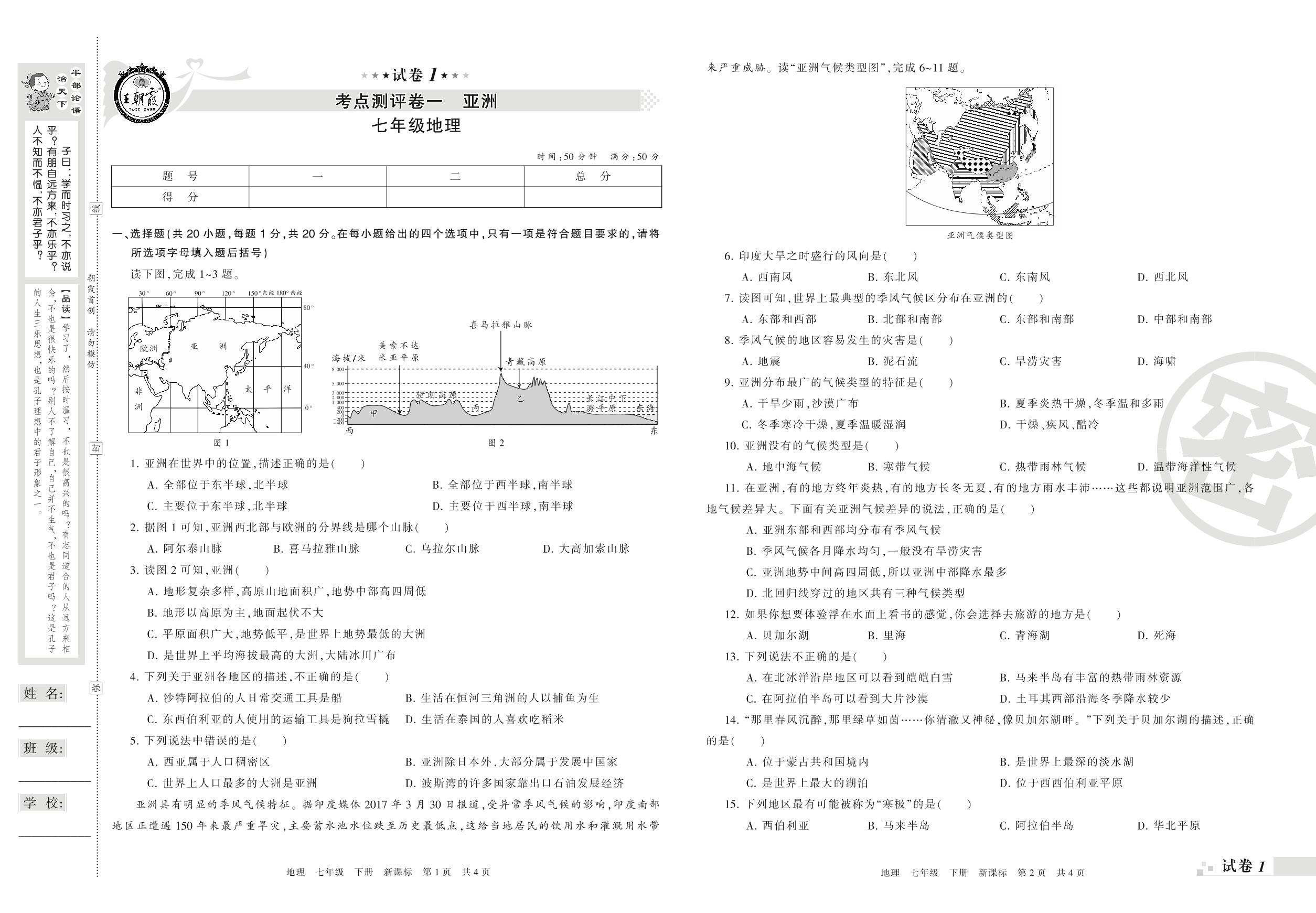 王朝霞期末测评卷——考点测评卷一 亚洲七年级下册地理(新课版)【1】