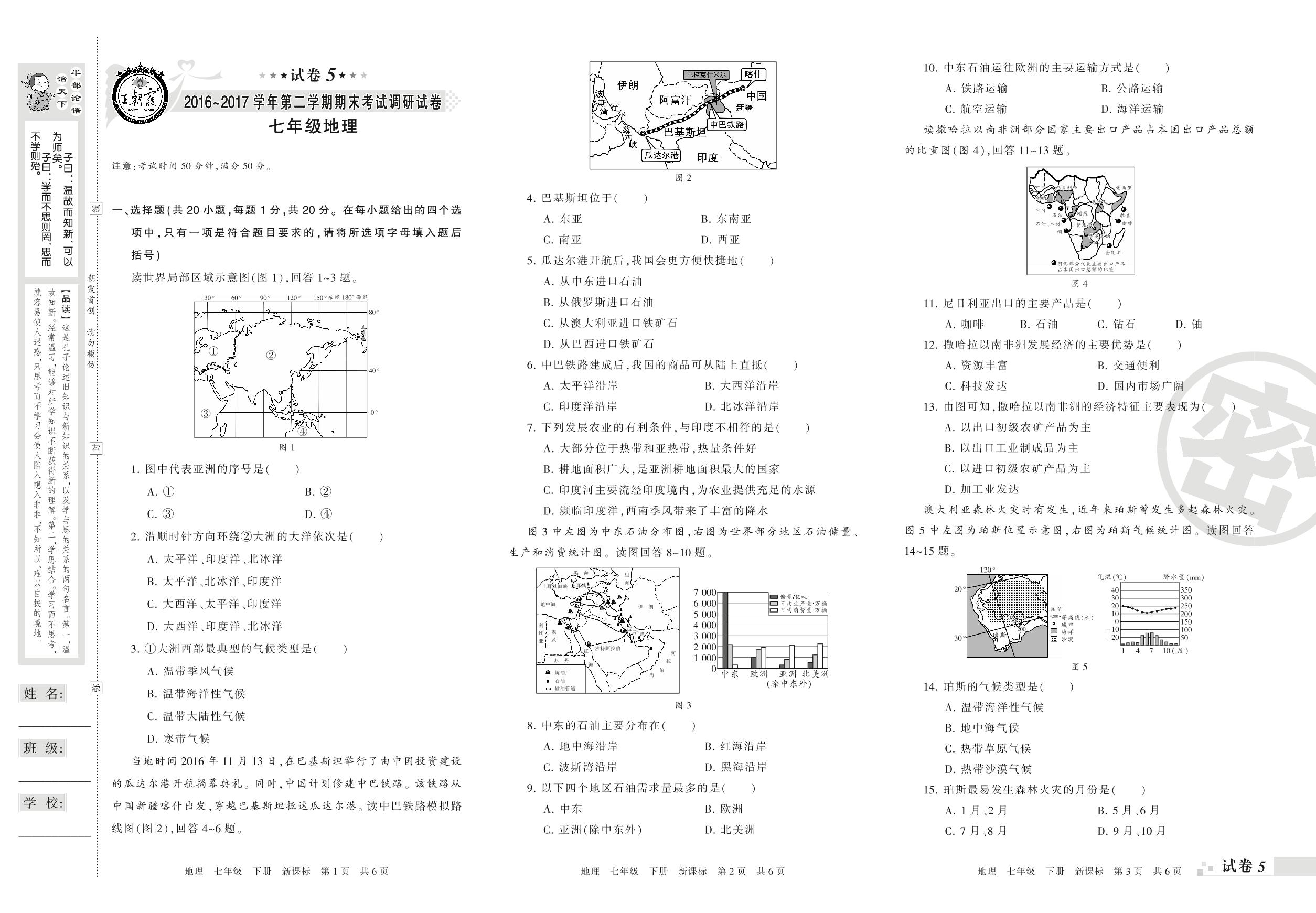 七年级地理新课标版下册期末卷