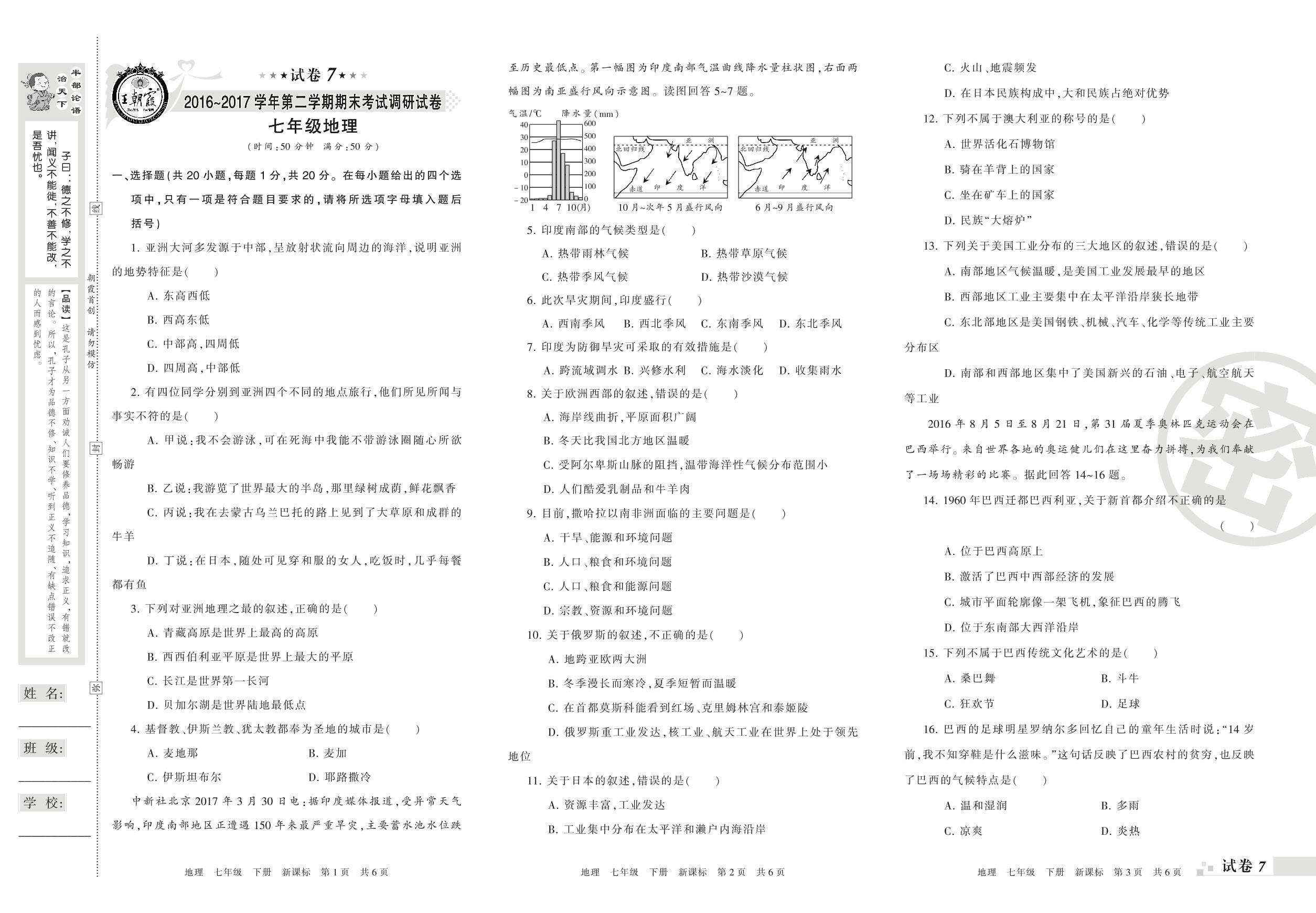 2016-2017学年第二学期期末考试调研试卷七年级地理(新课版)【7】