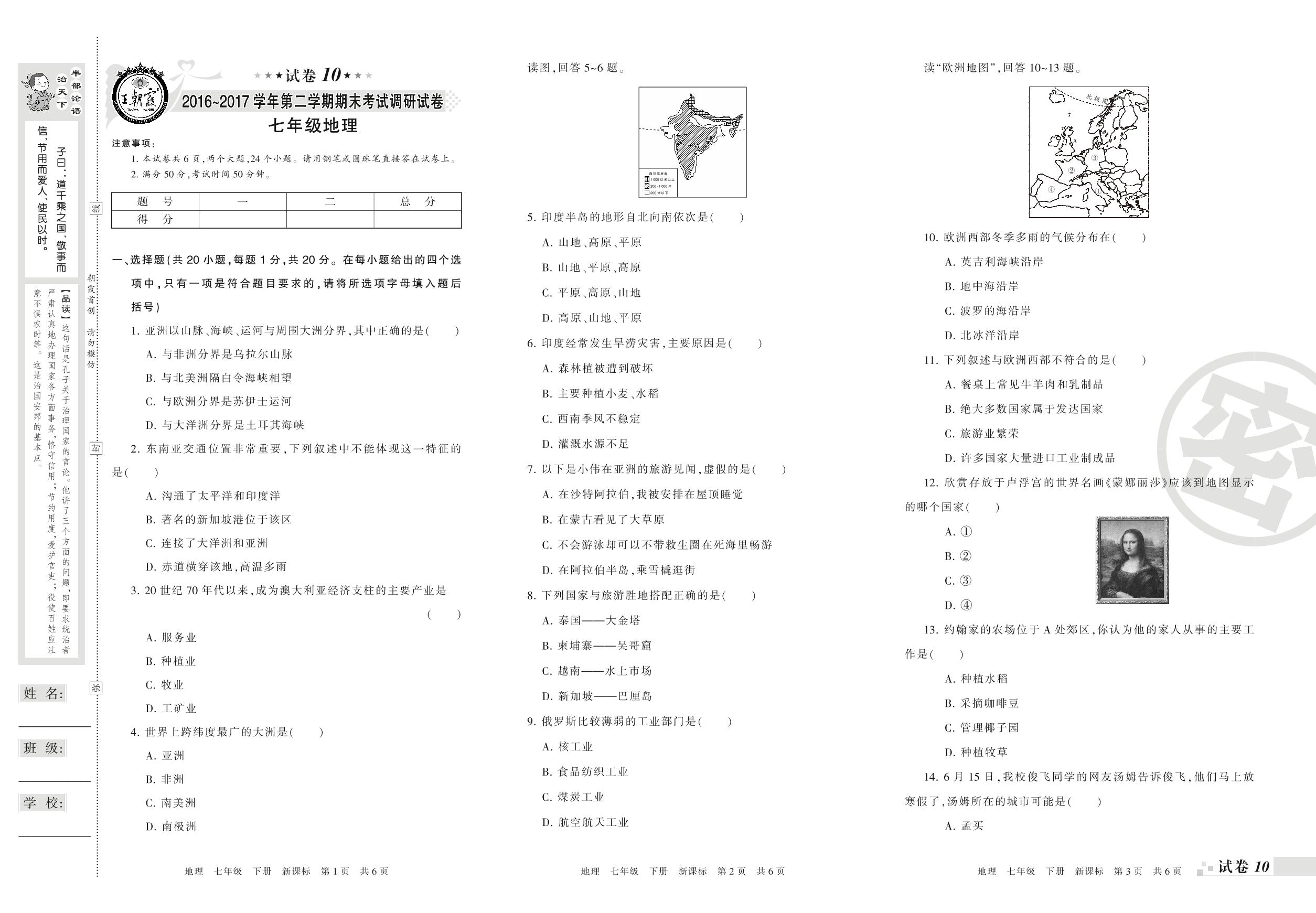 2016-2017学年第二学期期末考试调研试卷七年级地理(新课版)【10】