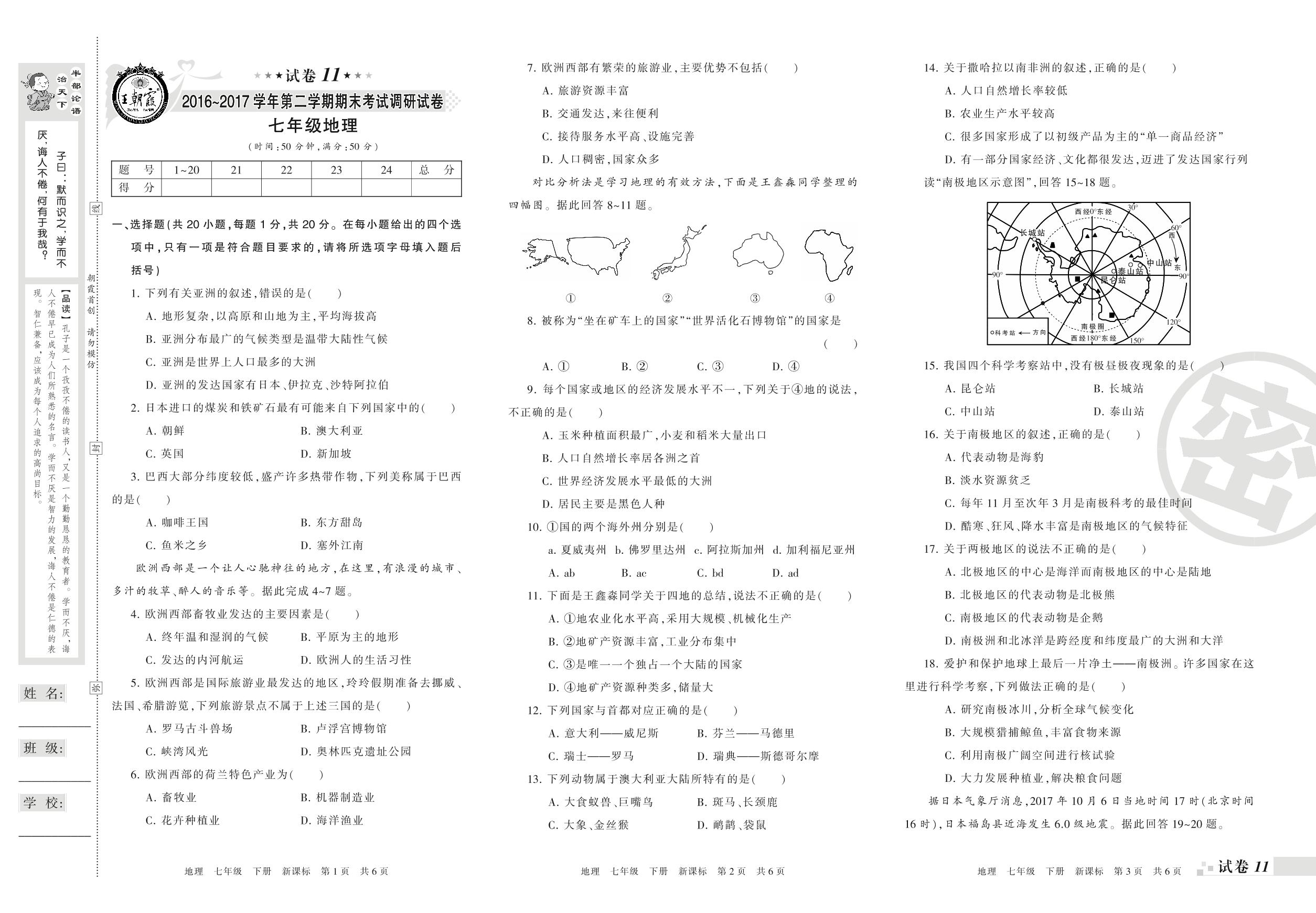 2016-2017学年第二学期期末考试调研试卷七年级地理(新课版)【11】